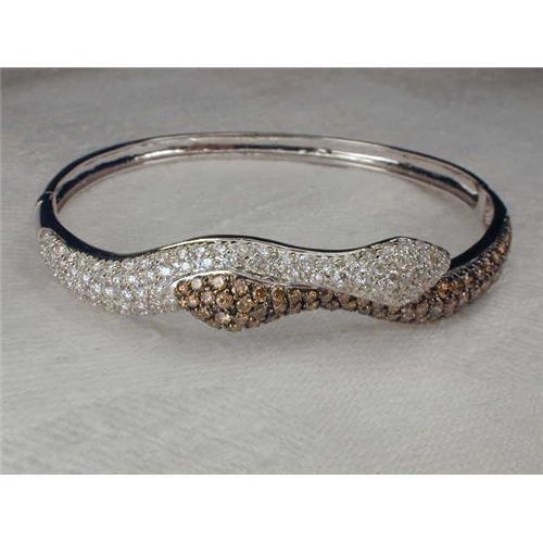 You are looking at an amazing 14K white gold snake bangle bracelet. The bracelet features numerous chocolate and white diamonds. The chocolate diamonds weigh a total of about 2.2 carats and the white diamonds weigh a total of about 1.6 carats. The bracelet fits up to a 6.75 inch wrist. It measures 2.5 inches from left to right by 2.25 inches from top to bottom. It weighs 15.9 grams. It is in mint condition.