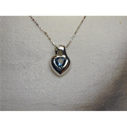 <table width="100%" border="0" cellspacing="0" cellpadding="4"><tr><td><em> </em></td></tr><tr> <td width="100%"> You are looking at a lovely estate 14K white gold blue topaz and diamond pendant. The heart shaped pendant holds 1 genuine blue topaz, measuring 7 mm long by 6 mm wide. There are 3 round diamonds, each measuring 1 mm in diameter. The pendant measures about 3/4 of an inch long (including the loop) by 1/2 an inch wide. It weighs 5.4 grams including the chain, which is 20 inches long. It is in mint condition. </td></tr><tr> <td> </td></tr><tr> <td>Reference #: zarj4p_4</td></tr><tr><td>Condition:Excellent</td></tr><tr><td>Year:Post-1945</td></tr><tr><td>Title:14K WG Gold Blue Topaz Diamond Heart Necklace</td></tr><tr><td>Location:New York</td></tr></table>