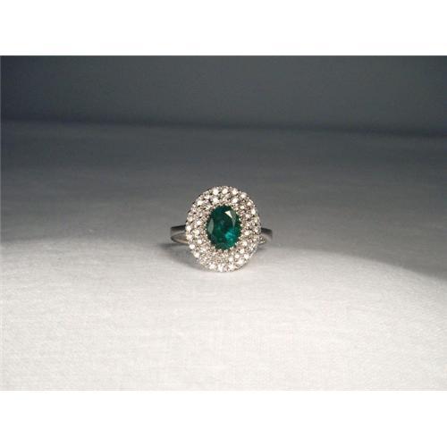 You are looking at a unique 14K white gold emerald and diamond cascade ring. This exquisite piece features one natural oval emerald measuring 8 mm by 6 mm, weighing 1.25 carats. The piece also features 42 brilliant diamonds measuring 2 mm each and totaling .65 of a carat. The top of the ring measures 5/8 of an inch long by 9/16 of an inch wide. The ring is a size 6.25. Sizing is available. It weighs 5.4 grams. It is in mint condition.