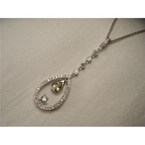 You are looking at an estate 14K white gold diamond and lemon quartz drop pendant. This beautiful piece features one tear shaped lemon quartz measuring 7 mm by 5mm, 2 round emeralds measuring 2 mm each, one round green amethyst measuring about 3 mm and 45 brilliant round diamonds measuring about 1 mm each. All gemstones are natural. The total weight of the diamonds is 0.30 of a carat. The pendant measures 2 and 1/8 inches long by 1/2 of an inch wide. It weighs 3.3 grams. It is in mint condition