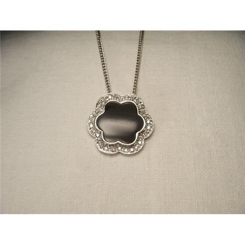 You are looking at an estate 14K white gold onyx and diamond flower pendant. This rare and beautiful piece features one flower shaped natural onyx measuring 12 mm across and 32 brilliant round diamonds measuring 1 mm each. The total weight of the diamonds is .17 of a carat. The pendant measures 11/16 of an inch across. It weighs 2.2 grams. It is in mint condition.