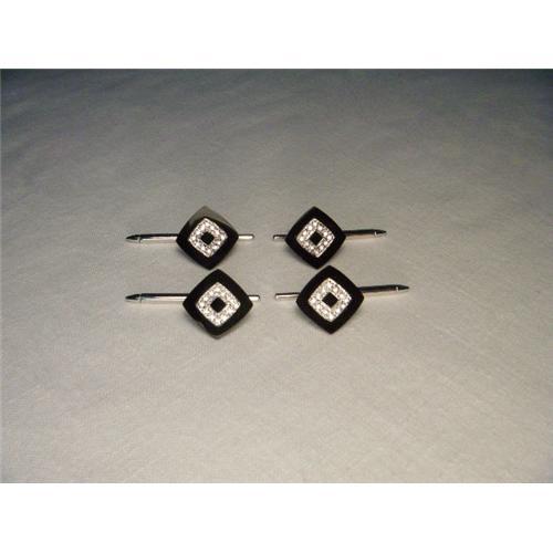 You are looking at a pair of 14K white gold onyx and diamond tuxedo studs. Each unique stud features 12 brilliant round diamonds measuring 1 mm each, set in a natural onyx design. The total weight of the diamonds is .31 of a carat. Each piece measures 1/2 of an inch across. The set of four weighs 8.2 grams. They are in mint condition.