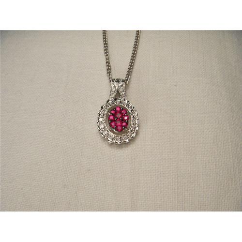 You are looking at an estate 14K white gold diamond and ruby filigree pendant. This beautiful piece features 10 natural round rubies measuring 2 mm each and 16 brilliant round diamonds measuring about 1 mm each. The total weight of the diamonds is 0.15 carat. The pendant measures 3/4 of an inch long by 3/8 of an inch wide. It weighs 1.5 grams. It is in mint condition.