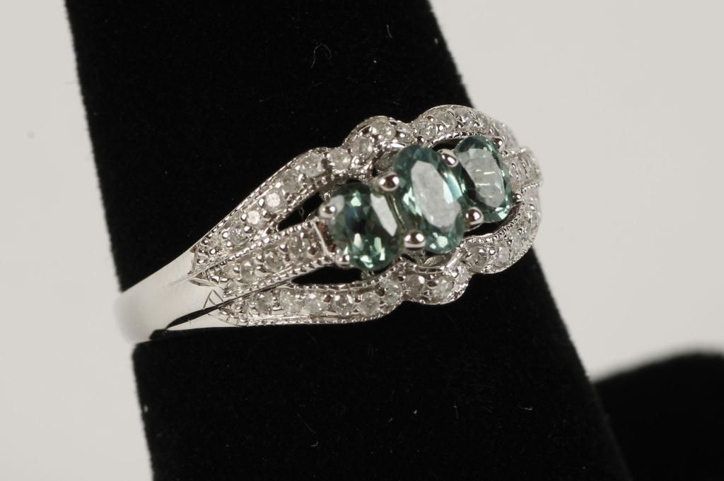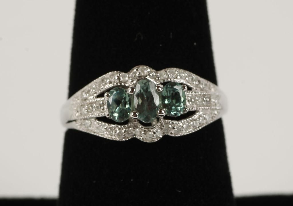 Enchanting 3 stone genuine and rare Alexandrites have good color change and total 0.7 ct, the diamonds total 0.2 ctw. Alexandrite gemstones are thought to bring luck, good fortune, and love. Overall weighs 2.1 grams, size 7.