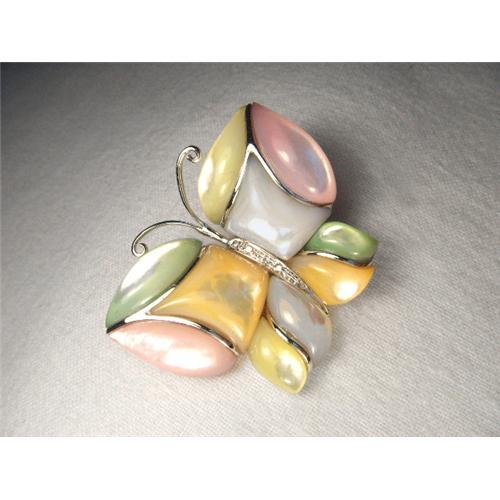 You are looking at an estate 14K white gold multi-color mother of pearl and diamond butterfly brooch. This beautiful piece features 2 brillant round diamonds, totaling .01 of a carat. The brooch measures 1 and 1/8 of an inch long by 1 and 7/16 of an inch wide. It weighs 9 grams. It is in mint condition.