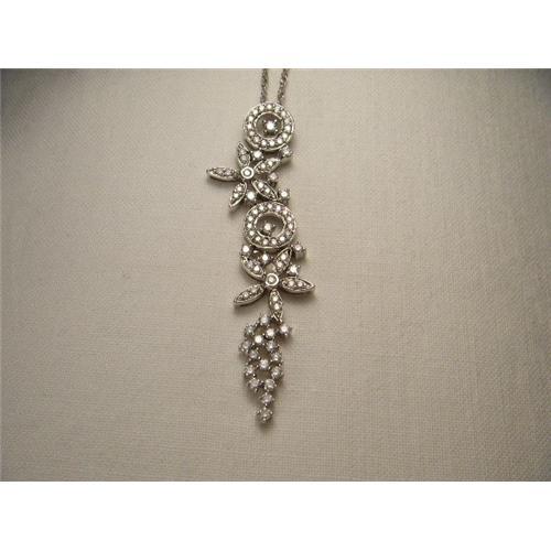 You are looking at an estate 14K white gold diamond floral drop pendant / necklace. This gorgeous piece features 79 brilliant round diamonds totaling 1 carat. The pendant measures 2 and 1/8 inches long by 1/2 of an inch wide. The necklace measures 16 inches long. The pendant weighs 6.1 grams. It is in mint condition.
