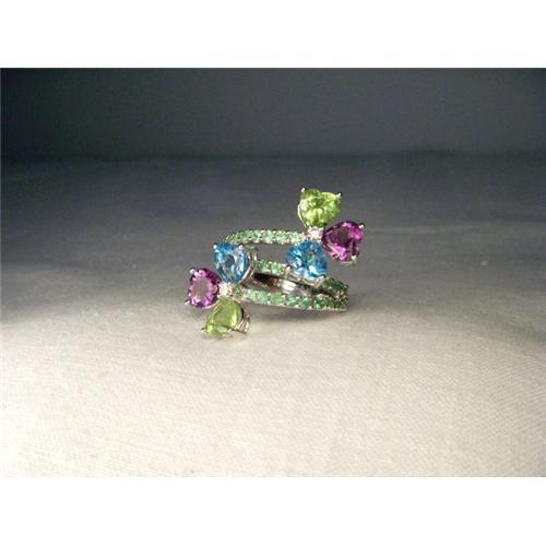 You are looking at an estate 14K white gold gemstone diamond heart ring. All gemstones are natural. This lovely piece features 2 flowers with 3 heart shaped petals. Each flower is made of one peridot, one amethyst and one blue topaz each measuring 6 mm by 6 mm. In the center of each flower is one brilliant round diamond measuring 3 mm each. The piece also features 31 round green tsavorites, representing the stems of the flowers, measuring 3 mm each. The front of this ring measures 7/8 of an inch wide. It is a size 6.75. Sizing is available. It weighs 8.1 grams. It is in mint condition.