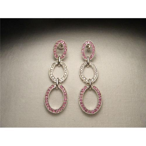 You are looking at a gorgeous pair of 14K white gold pink sapphire and diamond earrings. Each piece is made of 3 loops, each hanging from one another. Each earring features 37 natural round pink sapphires and 18 brilliant round diamonds measuring 1 mm each. The total weight of the diamonds is .30 of a carat. Each earring measures 1 and 3/4 of an inch long by 1/2 of an inch wide. The pair weighs 6.6 grams. They are in mint condition.