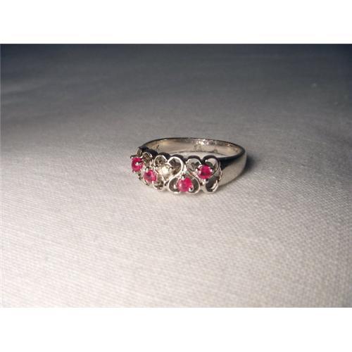 You are looking at a gorgeous estate 14K white gold ruby and diamond filigree heart ring. This uniquely designed piece holds 5 genuine rubies and a brilliant round diamond in the center. It is a size 6. Sizing is available. The ring weighs 3 grams. It is in mint condition.
