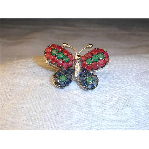You are looking at a unique 14K white gold butterfly brooch / pin. There are 20 rubies, 8 emeralds and 14 sapphires. All gemstones are natural. The total weight of the rubies is about 2 carats. The total weight of the sapphires is about one carat. The total weight of the emeralds is about .5 carats. The pin measures 3/4 of an inch long by 1 inch wide. It weighs 4.4 grams. It is in mint condition.