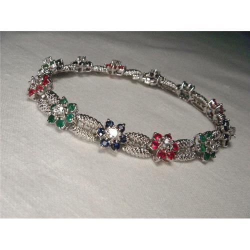 You are looking at an estate 14K white gold diamond and gemstone floral bracelet. This exquisite piece features 24 rubies, 24 emeralds and 24 sapphires measuring 2 mm in diameter each. The bracelet also features 12 brilliant round diamonds measuring 3 mm in diameter each and totaling 2.2 carats. All gemstones are natural. The bracelet meaures 7 inches long by 5/16 of an inch wide. It weighs 17.5 grams. It is in mint condition.