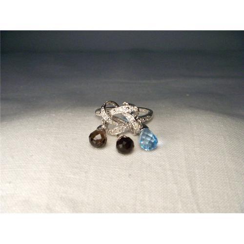 You are looking at an estate 14K white gold gemstone diamond ring. All gemstones are natural. This beautiful piece features 2 briolette smokey and 2 briolette blue topazes measuring 6 mm by 5 mm dangling from the front of the ring. The ring also features 14 brilliant round diamonds measuring 1 mm each set in a white gold pretzel knot design. The front of this ring measures 3/4 of an inch wide. It is a size 7. Sizing is available. It weighs 4 grams. It is in mint condition.