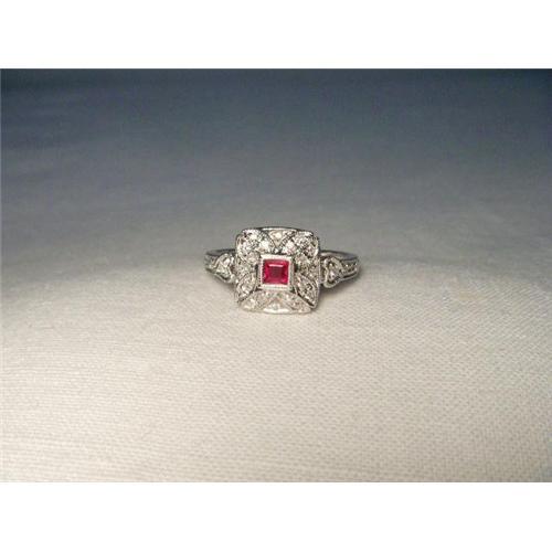 You are looking at an estate 14K white gold ruby and diamond filigree ring. This beautiful piece features one natural princess cut ruby measuring 3 mm across, weighing .20 of a carat. Thw ring also features 28 brilliant round diamonds with a total weight of .15 of a carat. The top of the piece measures 5/16 of an inch across. The ring is a size 7. Sizing is available. It weighs 3.1 grams. It is in mint condition.