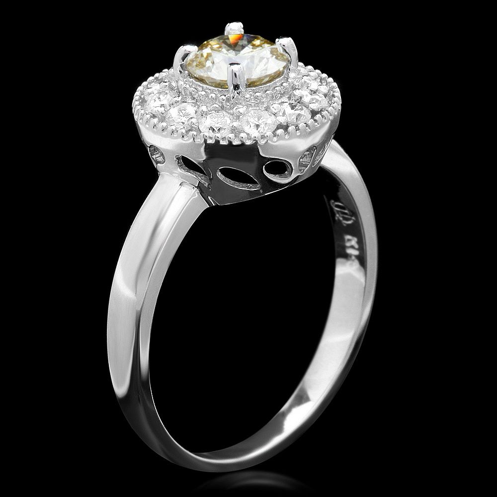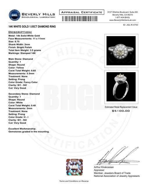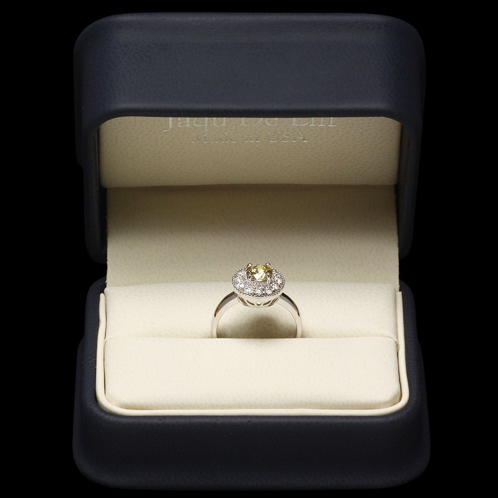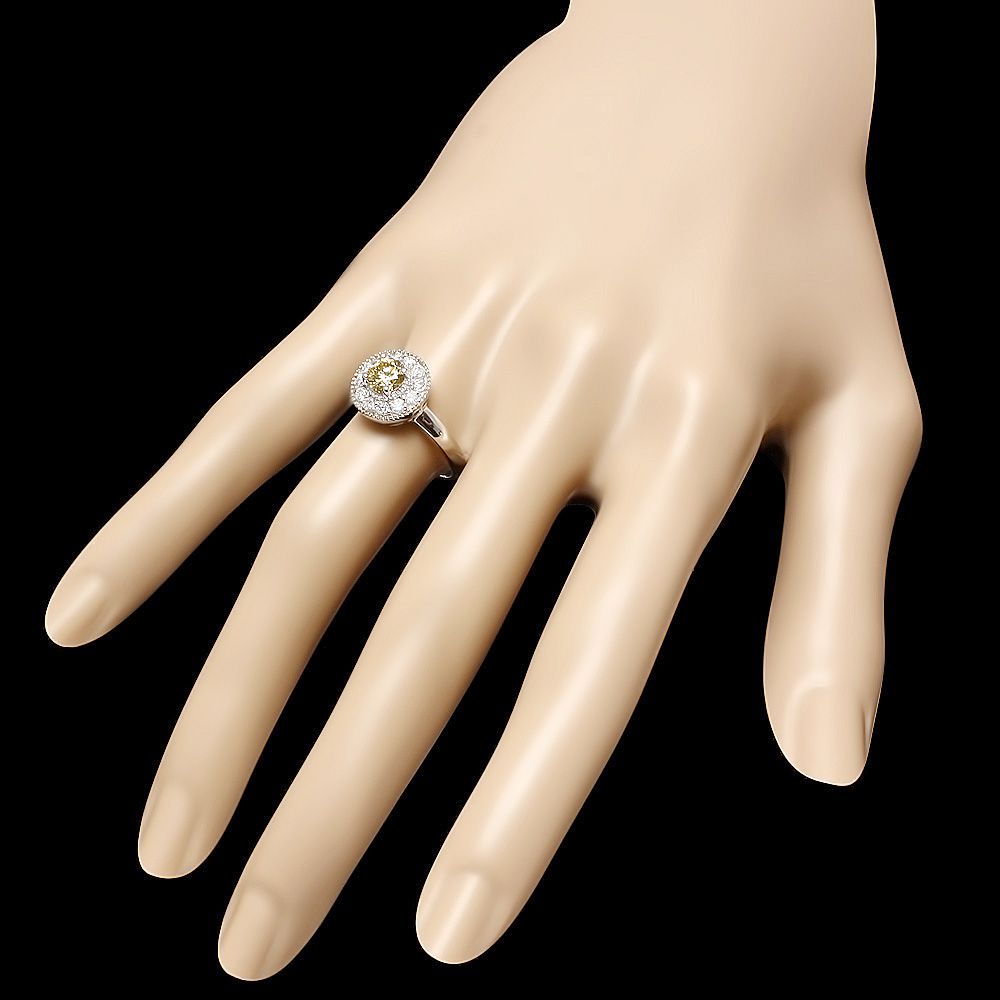Retail: $5100.00 ****** Metal: 14k Solid White Gold / Size: 6.75 / Total Item Weight: 3.5 grams / Country Made: USA / / Main Stone: Diamond / Color: Yellow / Carat Total Weight: 0.65 / Treatment: None / Color Grade: Fancy Color / Clarity: SI1 - SI2 / Cut: Very Good / / Secondary Stone: Diamond / Carat Total Weight: 0.40 / Treatment: None / Color Grade: H - I / Clarity: SI1 - SI2 / Cut: Very Good / ****** Ref: JQL-R-4743