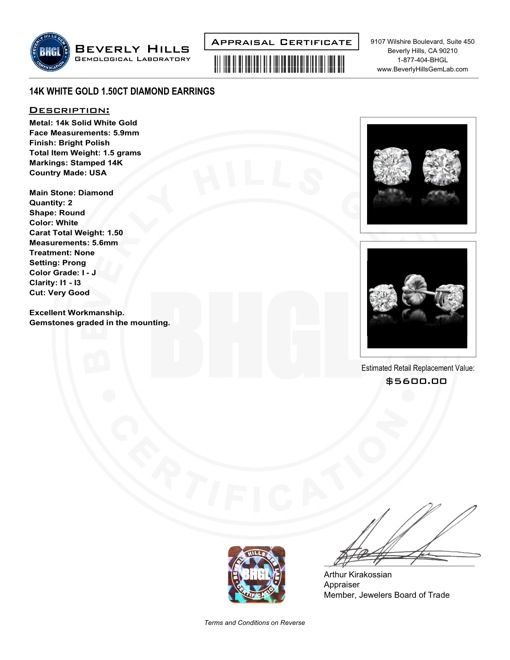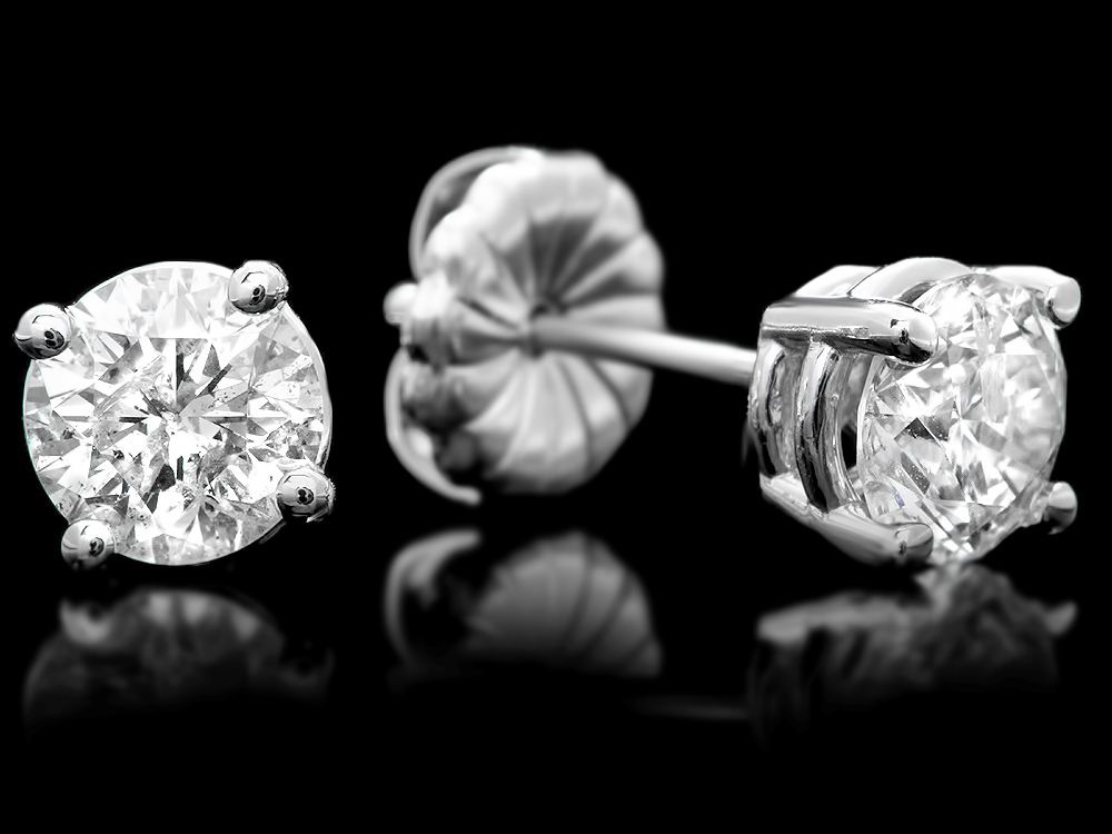 Retail: $5600.00 ****** Metal: 14k Solid White Gold / Total Item Weight: 1.5 grams / Country Made: USA / / Main Stone: Diamond / Color: White / Carat Total Weight: 1.50 / Treatment: None / Color Grade: I - J / Clarity: I1 - I3 / Cut: Very Good / ****** Ref: JQL-ER-7693