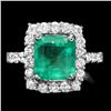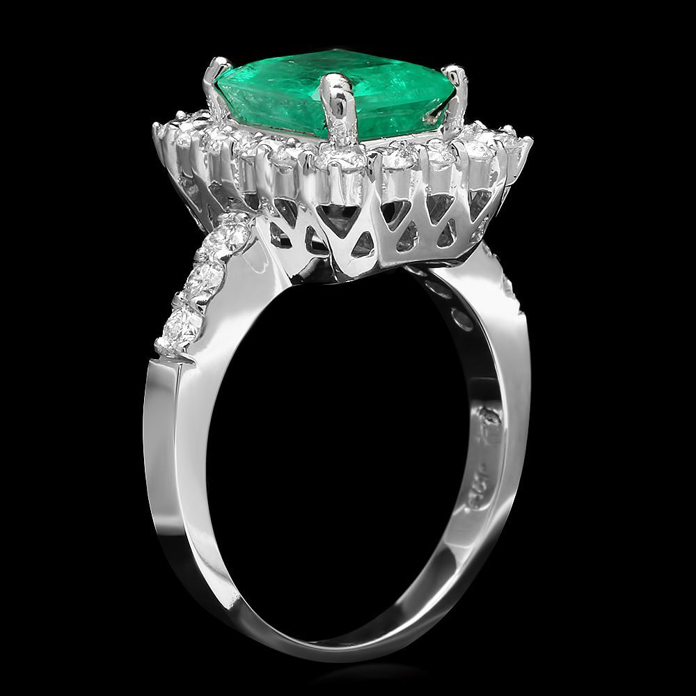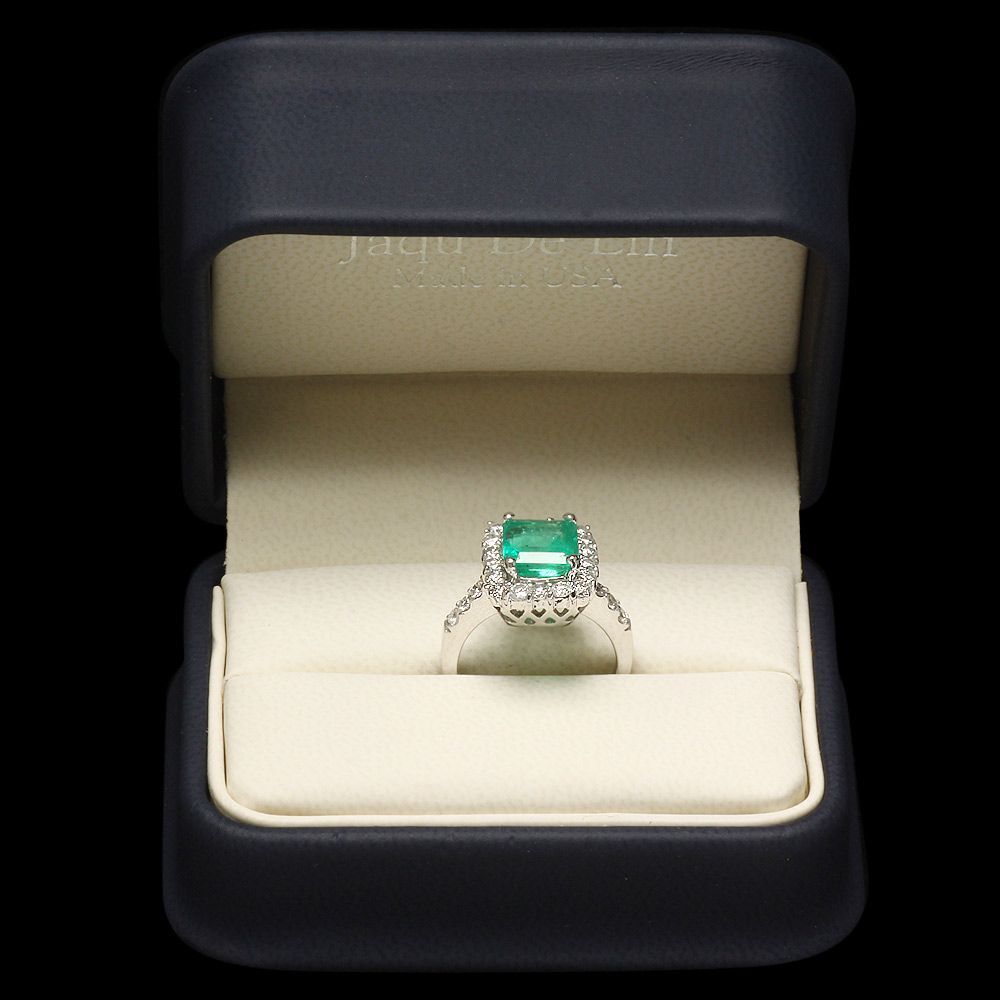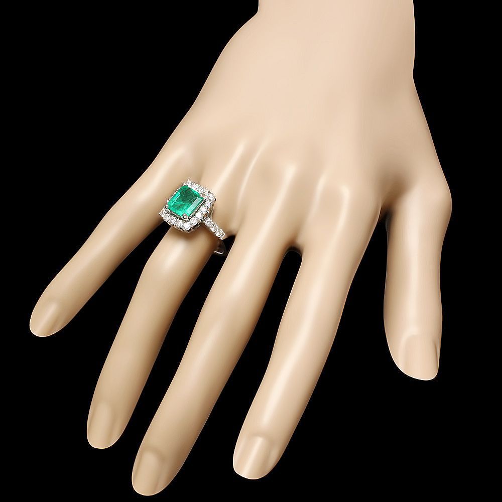 This lovely ladies ring is crafted in solid 14k White Gold and features a 1.50 carat 100% Natural Emerald mined from Colombia + accented with 24 sparkling eye-clean natural diamonds, totaling 1.15 carats. Excellent craftsmanship. Made in USA.