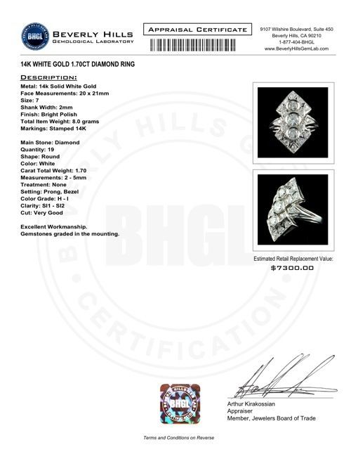 Regarding Appraised Jewelry and Loose Stones - WESTBURY AUCTION GALLERIES sends them out to a third party for Retail Replacement Value Appraisals, which are the most common. These types of evaluations are written for insurance needs. This would be the cost to replace the jewelry with an item of equal quality and kind, considered to be the current market price or the replacement value. This type of appraisal is done to protect you in the event of damage or loss of a valuable item. Our appraisals are conducted by independent 3rd Party appraisal firms that utilizes Certified GIA Gemologist. Appraisals should be used for verification of gemstone and/or metal weight, size, and grade only, not actual value. Appraisal value should be considered for insurance purposes only, not actual value, as price varies greatly from retail locations thru out the world. Items should not be purchased with the expectation to resell for appraisal price, or for profit.