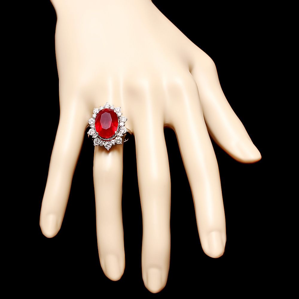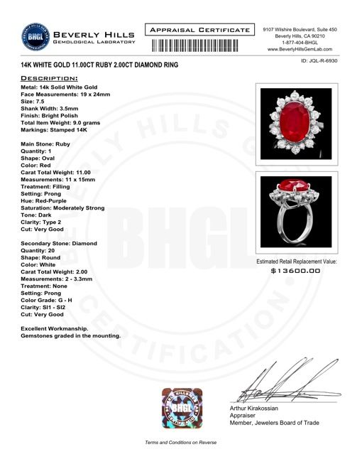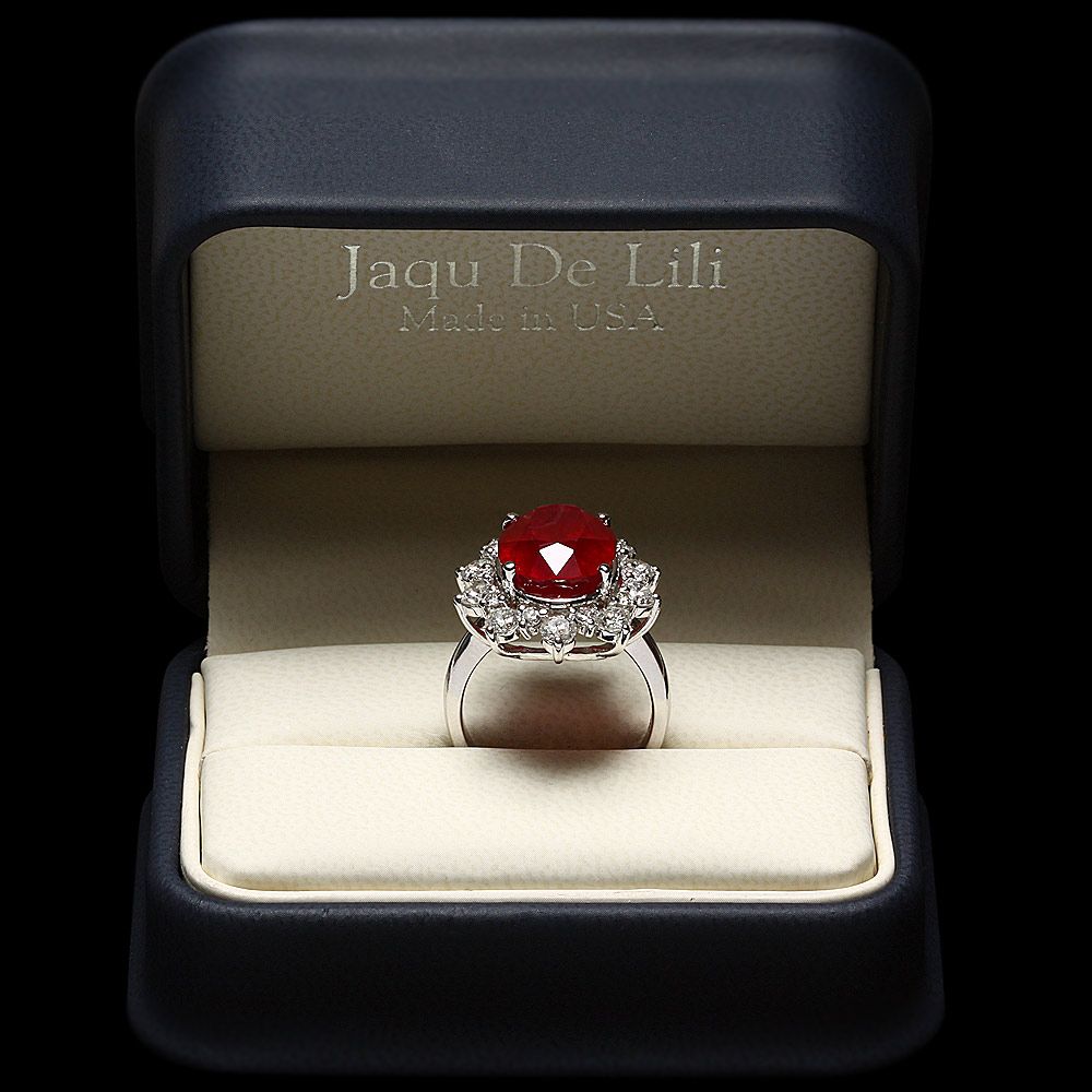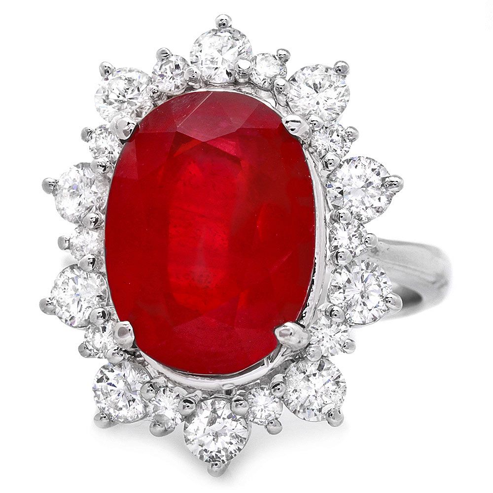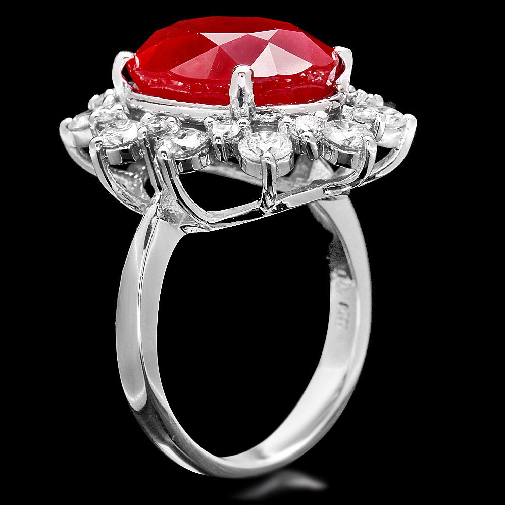 Retail: $13600.00 ****** Metal: 14k Solid White Gold / Size: 7.5 / Total Item Weight: 9.0 grams / Country Made: USA / / Main Stone: Ruby / Color: Red / Carat Total Weight: 11.00 / Treatment: Filling / Clarity: Type 2 / Cut: Very Good / / Secondary Stone: Diamond / Carat Total Weight: 2.00 / Treatment: None / Color Grade: G - H / Clarity: SI1 - SI2 / Cut: Very Good / ****** Ref: JQL-R-6930