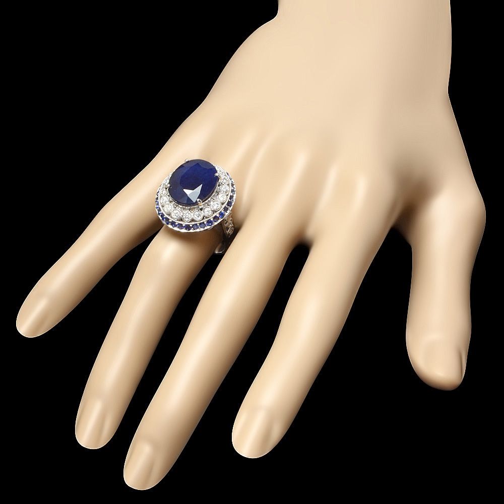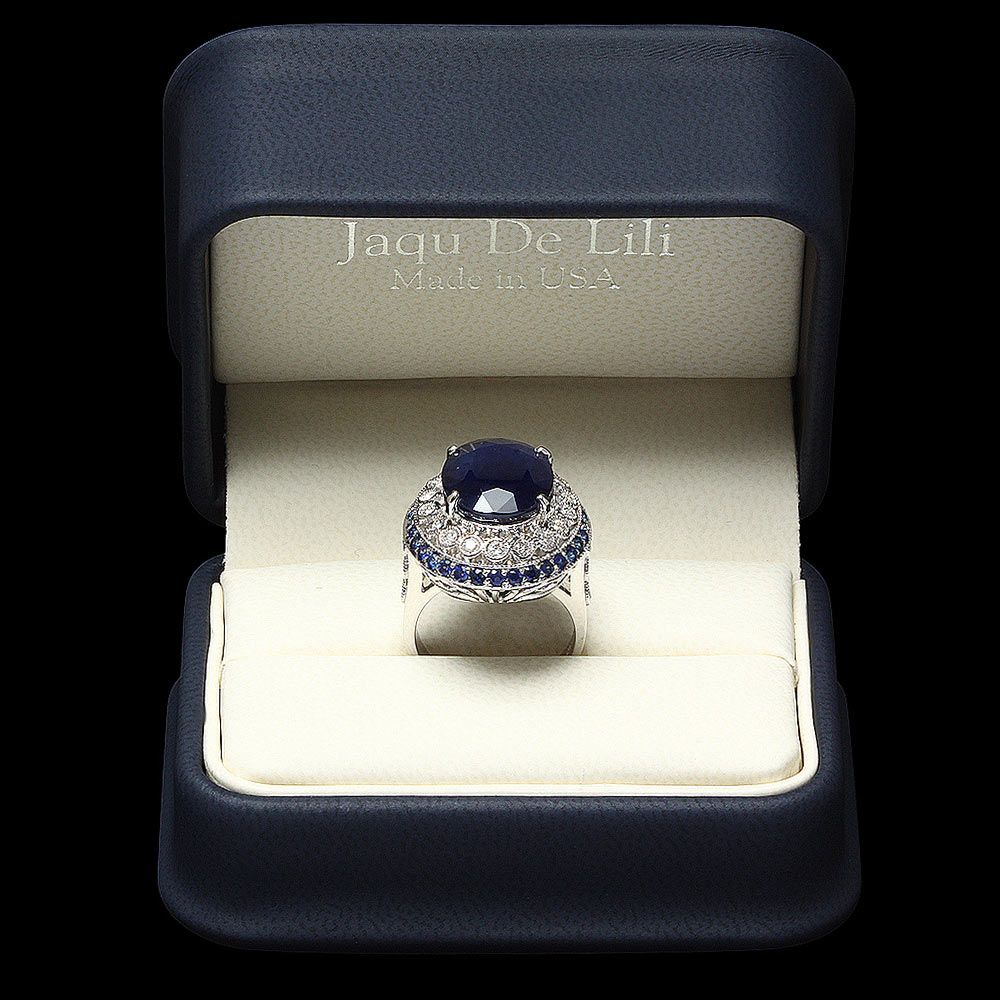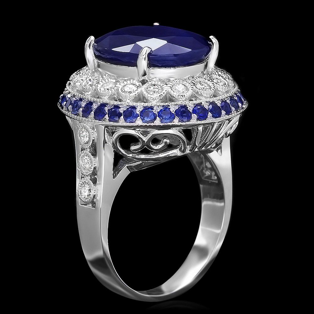 Retail: $8800.00 ****** Metal: 14k Solid White Gold / Size: 7.25 / Total Item Weight: 10.8 grams / Country Made: USA / / Main Stone: Sapphire / Color: Blue / Carat Total Weight: 10.00 / Treatment: Heating / Clarity: Type 2 / Cut: Very Good / / Secondary Stone: Diamond / Carat Total Weight: 0.60 / Treatment: None / Color Grade: H - I / Clarity: SI1 - SI2 / Cut: Very Good / / Side Stone: Sapphire / Color: Blue / Carat Total Weight: 1.20 / Treatment: Heating / Clarity: Type 2 / Cut: Very Good / ****** Ref: JQL-R-4330