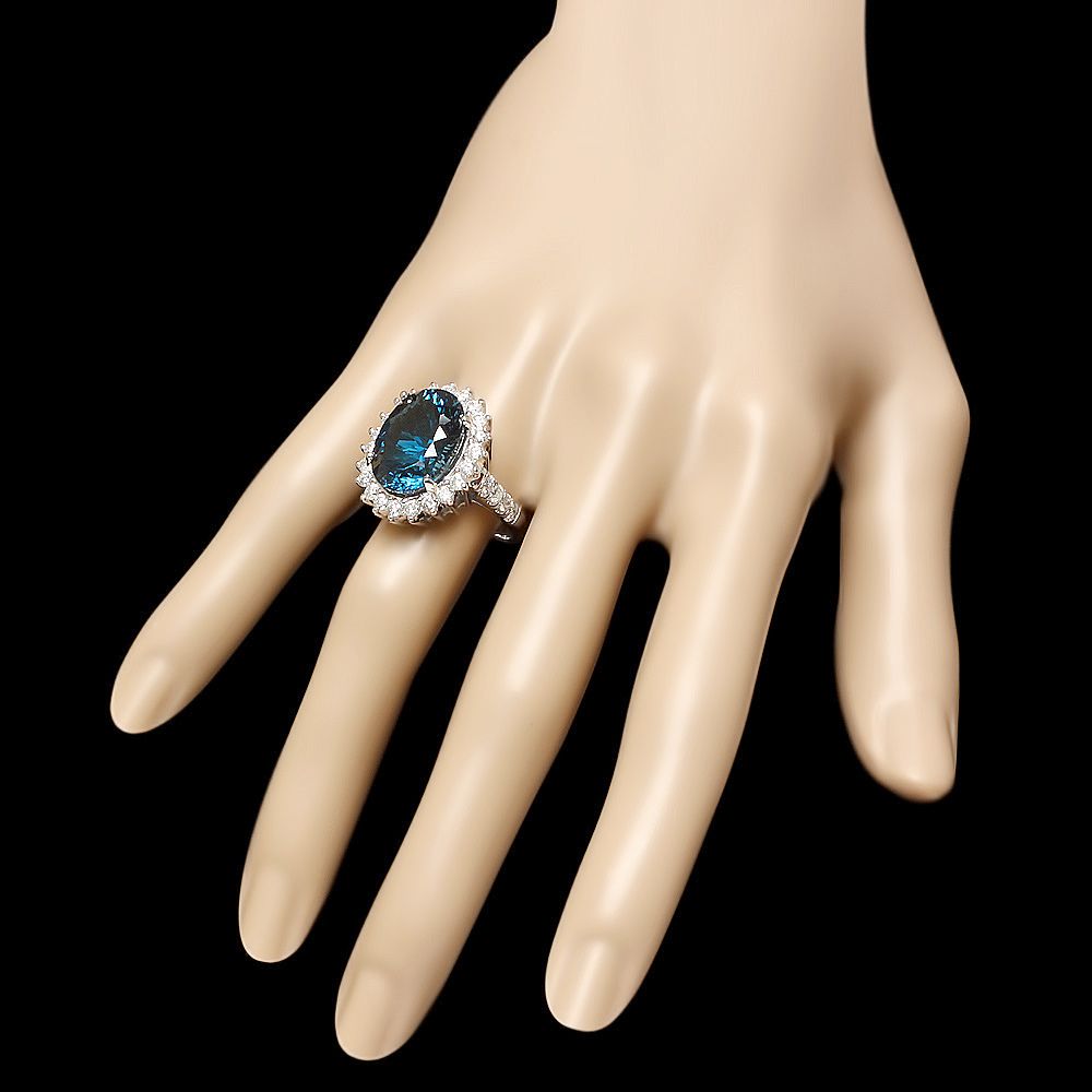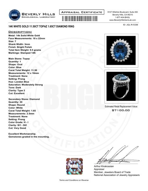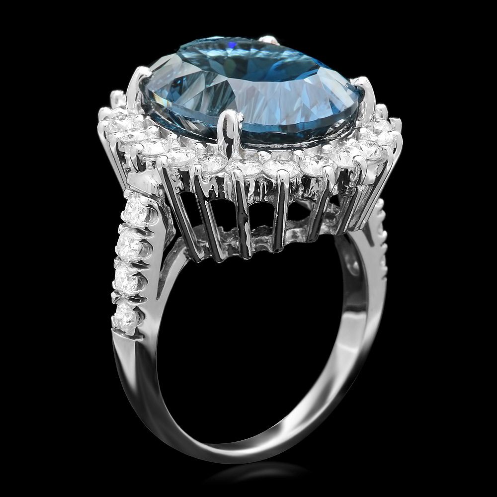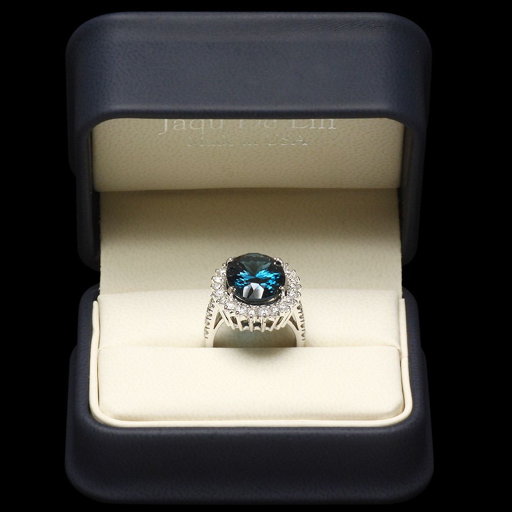 Retail: $7100.00 ****** Metal: 14k Solid White Gold / Size: 7 / Total Item Weight: 9.5 grams / Country Made: USA / / Main Stone: Topaz / Color: Blue / Carat Total Weight: 11.50 / Treatment: None / Clarity: Type 2 / Cut: Excellent / / Secondary Stone: Diamond / Carat Total Weight: 1.65 / Treatment: None / Color Grade: H - I / Clarity: SI1 - SI2 / Cut: Very Good / ****** Ref: JQL-R-5336