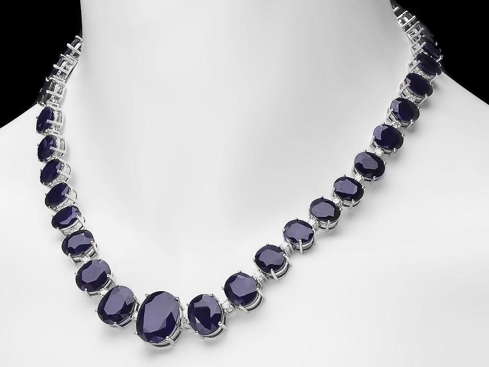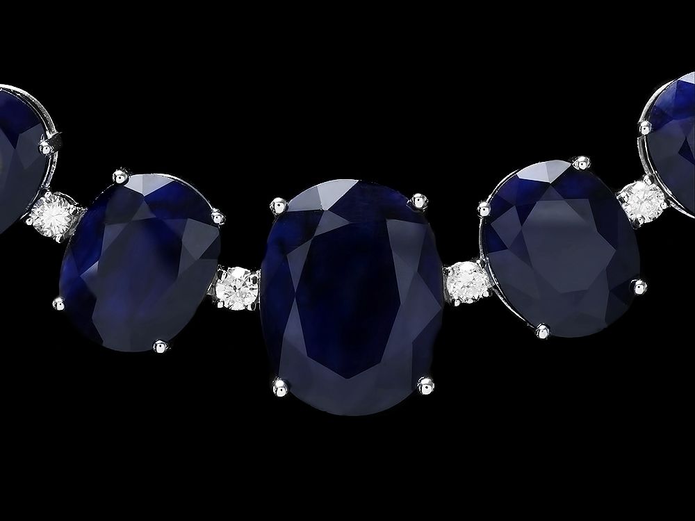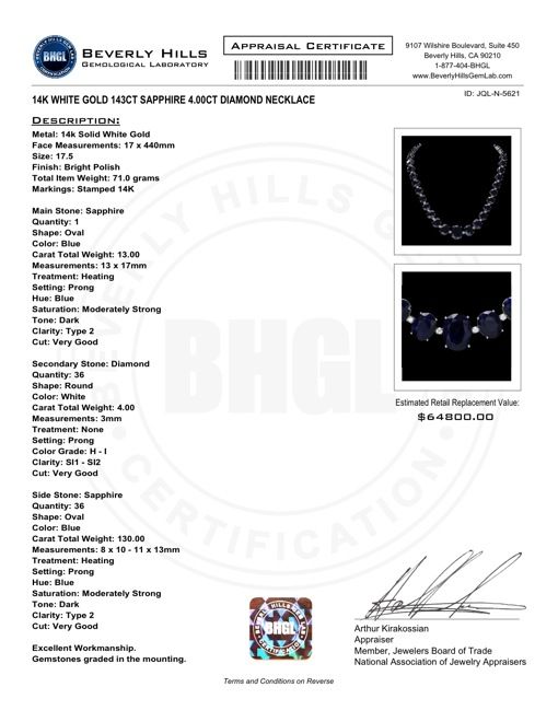 Retail: $64800.00 ****** Metal: 14k Solid White Gold / Size: 17.5 / Total Item Weight: 71.0 grams / Country Made: USA / / Main Stone: Sapphire / Color: Blue / Carat Total Weight: 13.00 / Treatment: Heating / Clarity: Type 2 / Cut: Very Good / / Secondary Stone: Diamond / Carat Total Weight: 4.00 / Treatment: None / Color Grade: H - I / Clarity: SI1 - SI2 / Cut: Very Good / / Side Stone: Sapphire / Color: Blue / Carat Total Weight: 130.00 / Treatment: Heating / Clarity: Type 2 / Cut: Very Good / ****** Ref: JQL-N-5621