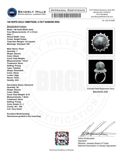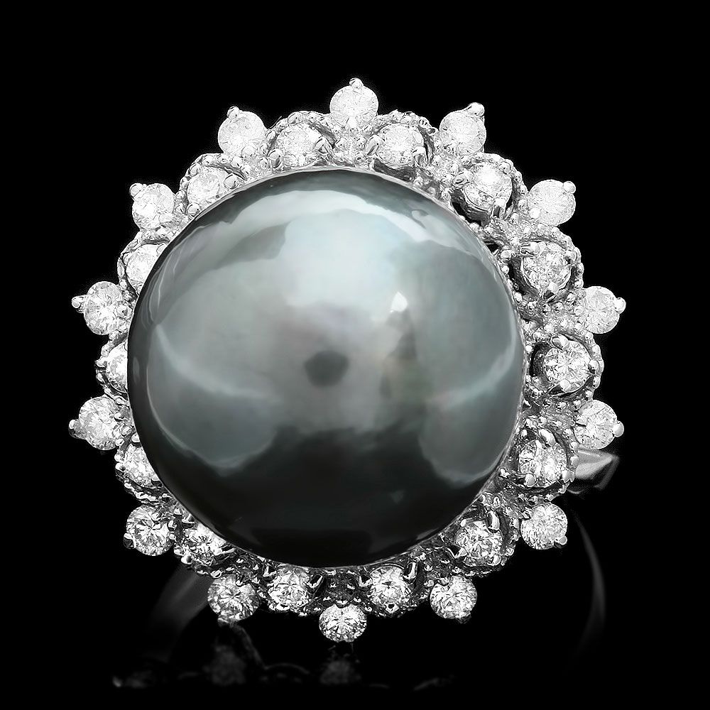 Retail: $6200.00 ****** Metal: 14k Solid White Gold / Size: 7 / Total Item Weight: 10.0 grams / Country Made: USA / / Main Stone: Pearl / Color: Black / Treatment: None / Type: Tahitian / Color: Silver / Quality: AA+ / / Secondary Stone: Diamond / Carat Total Weight: 0.70 / Treatment: None / Color Grade: H - I / Clarity: SI1 - SI2 / Cut: Very Good / ****** Ref: JQL-R-5329