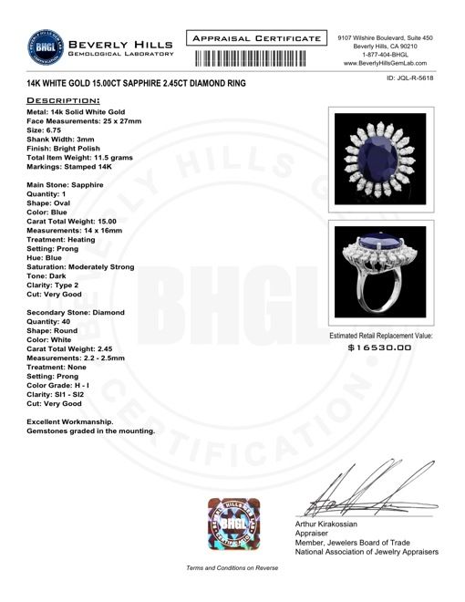 Retail: $16530.00 ****** Metal: 14k Solid White Gold / Size: 6.75 / Total Item Weight: 11.5 grams / Country Made: USA / / Main Stone: Sapphire / Color: Blue / Carat Total Weight: 15.00 / Treatment: Heating / Clarity: Type 2 / Cut: Very Good / / Secondary Stone: Diamond / Carat Total Weight: 2.45 / Treatment: None / Color Grade: H - I / Clarity: SI1 - SI2 / Cut: Very Good / ****** Ref: JQL-R-5618