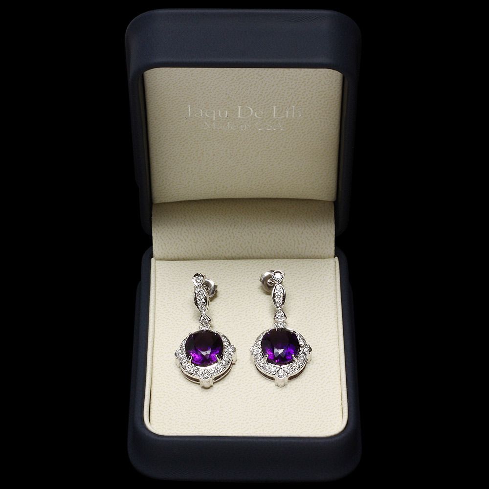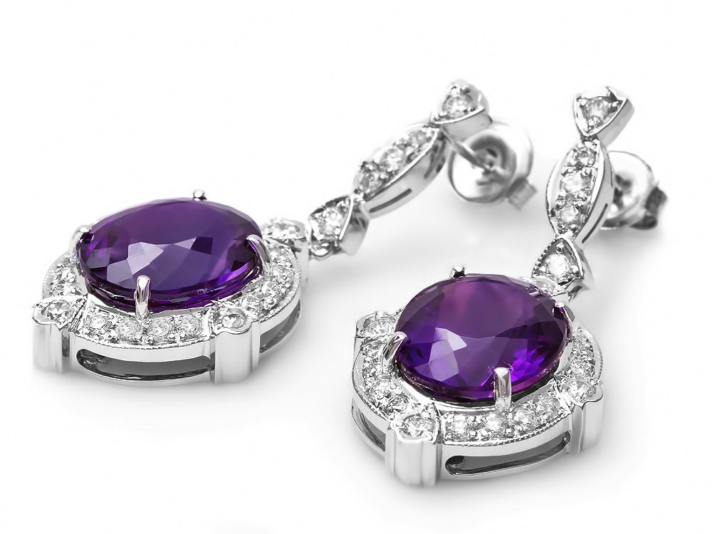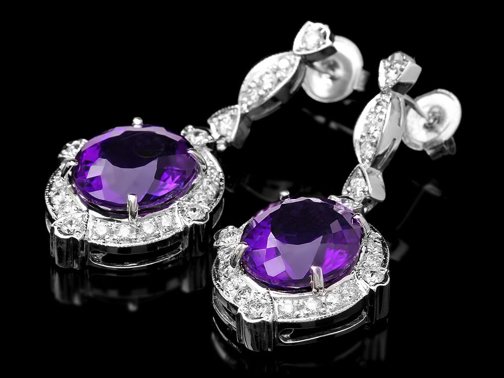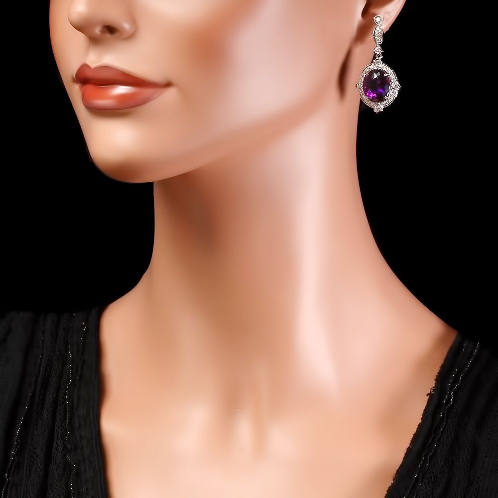 Retail: $16375.00 ****** Metal: 14k Solid White Gold / Total Item Weight: 12.5 grams / Country Made: USA / / Main Stone: Amethyst / Color: Purple / Carat Total Weight: 16.00 / Treatment: None / Clarity: Type 2 / Cut: Very Good / / Secondary Stone: Diamond / Carat Total Weight: 1.70 / Treatment: None / Color Grade: G - H / Clarity: SI1 - SI2 / Cut: Very Good / ****** Ref: JQL-ER-5730