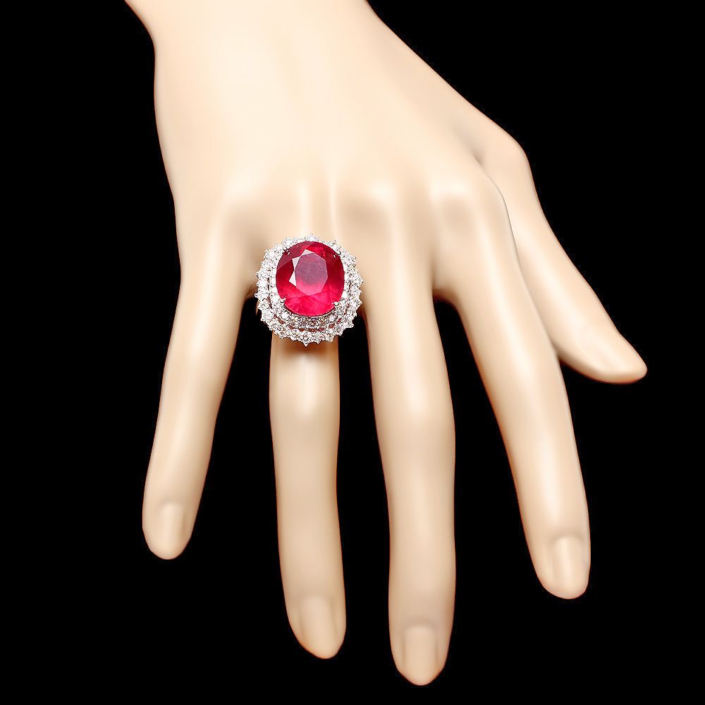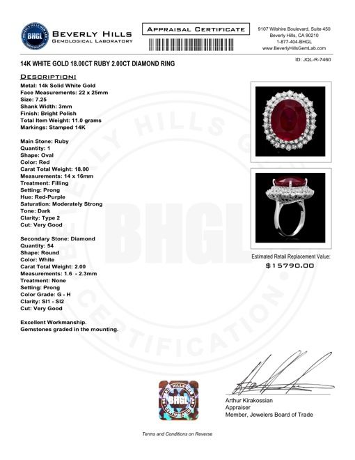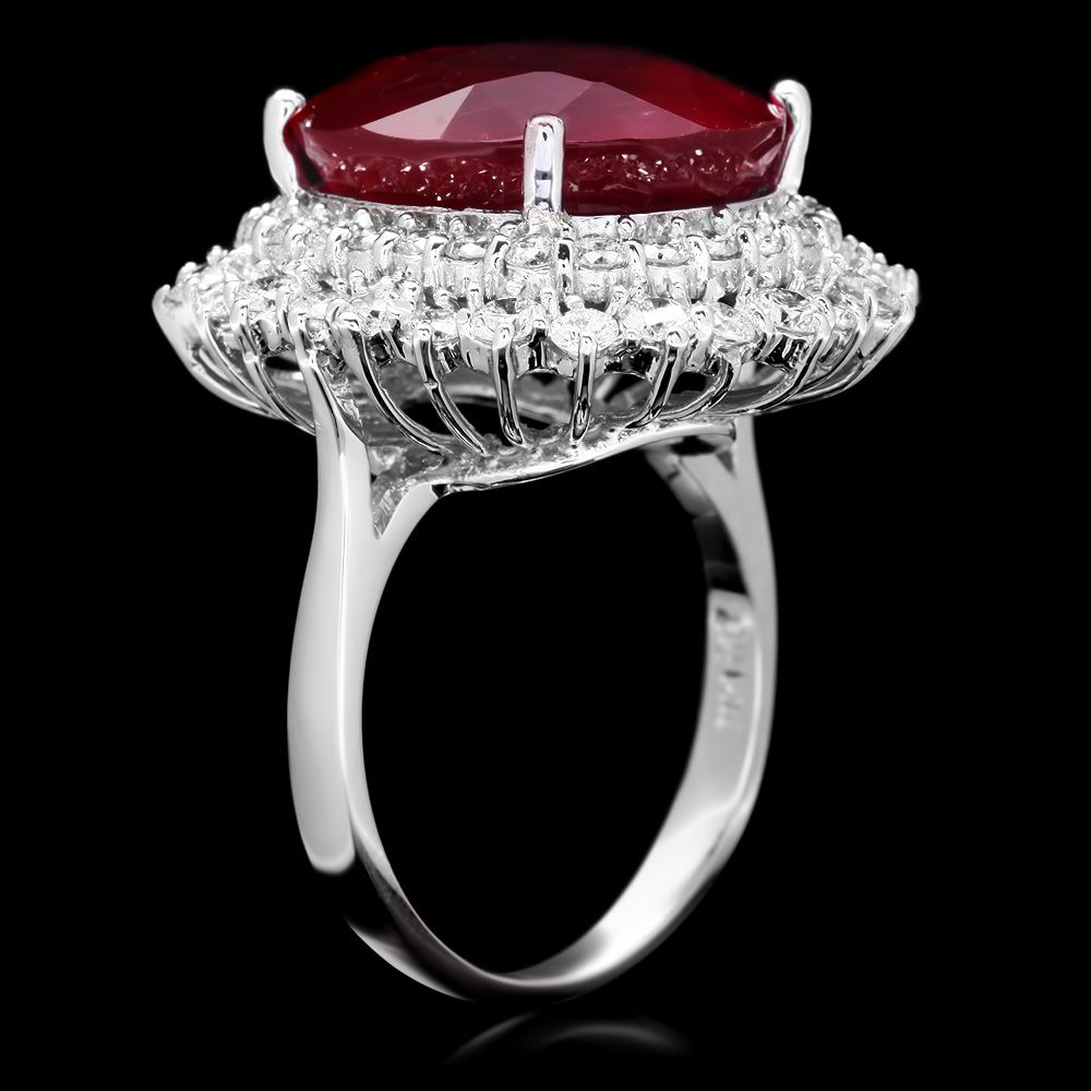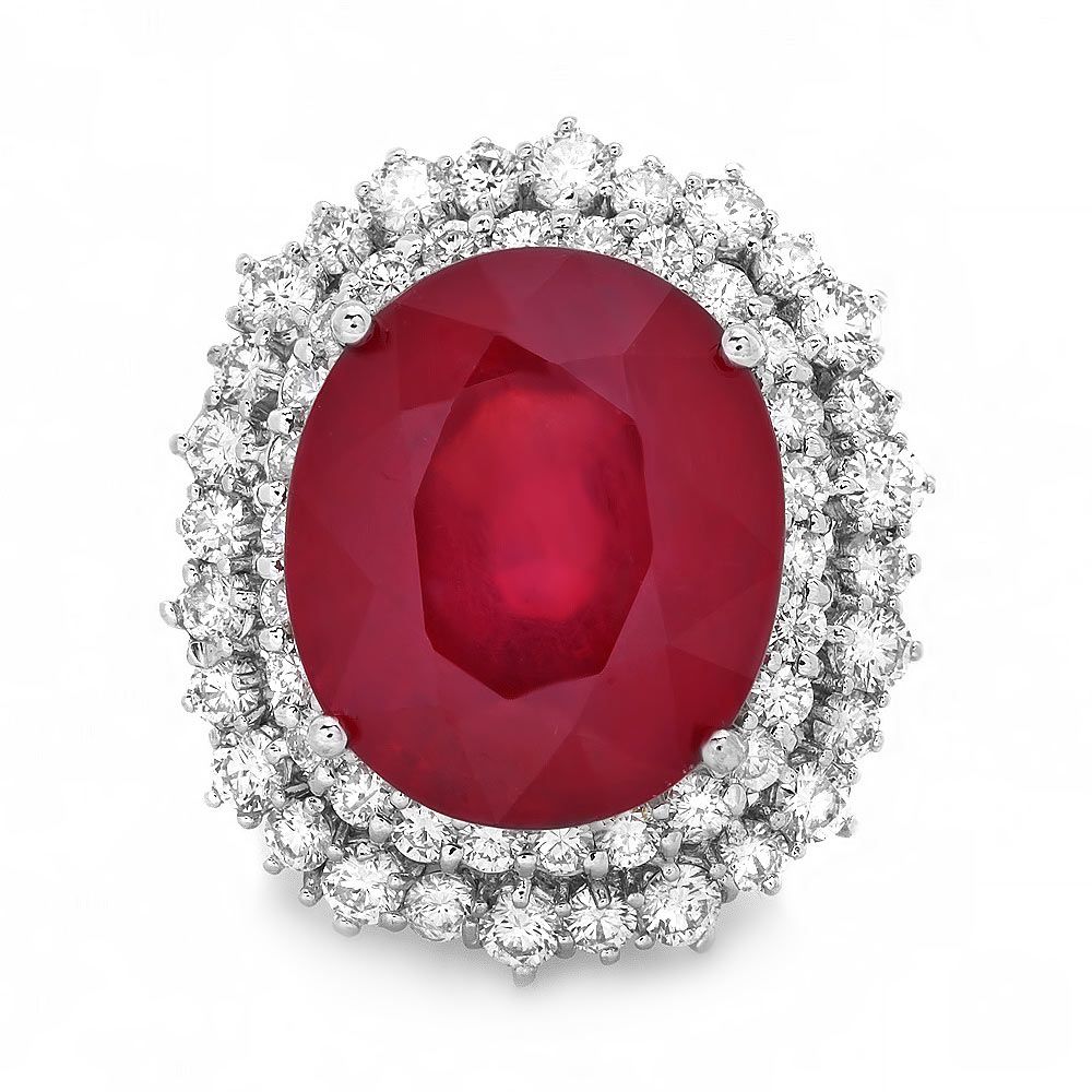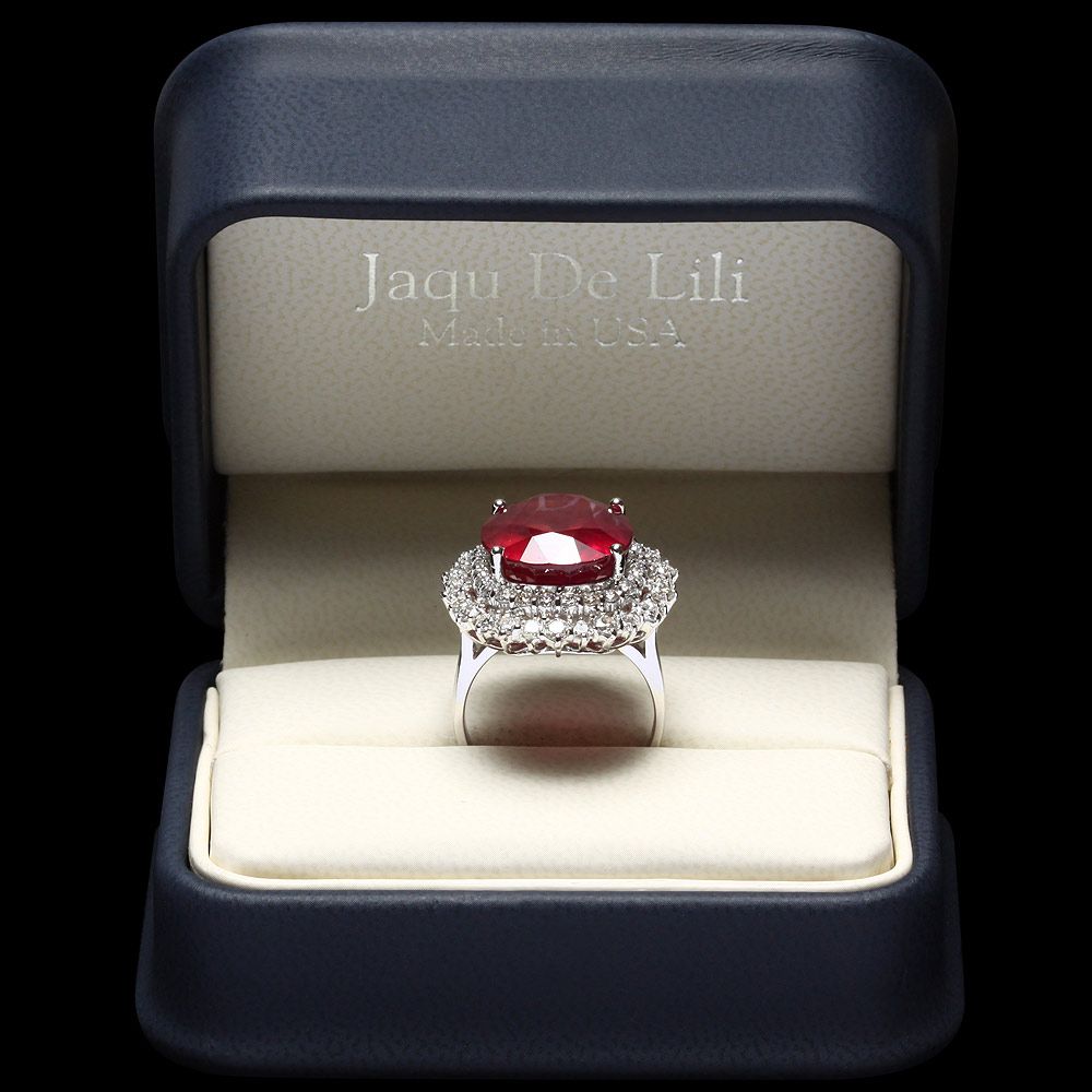 Retail: $15790.00 ****** Metal: 14k Solid White Gold / Size: 7.25 / Total Item Weight: 11.0 grams / Country Made: USA / / Main Stone: Ruby / Color: Red / Carat Total Weight: 18.00 / Treatment: Filling / Clarity: Type 2 / Cut: Very Good / / Secondary Stone: Diamond / Carat Total Weight: 2.00 / Treatment: None / Color Grade: G - H / Clarity: SI1 - SI2 / Cut: Very Good / ****** Ref: JQL-R-7460