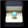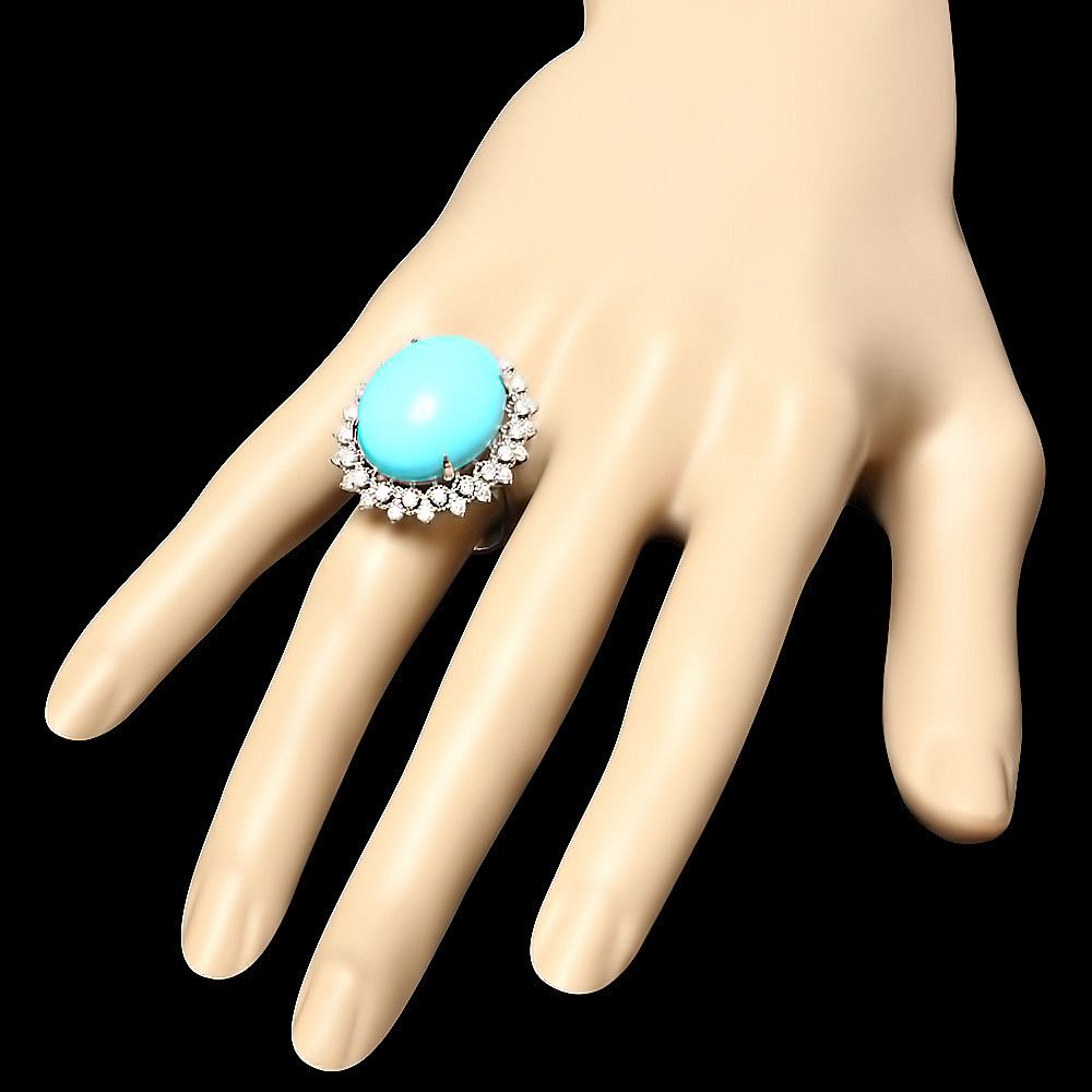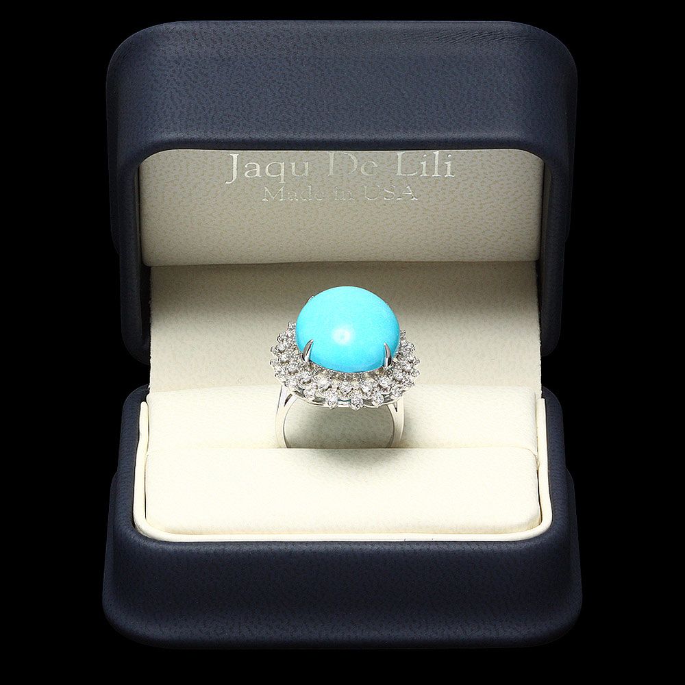 Retail: $7800.00 ****** Metal: 14k Solid White Gold / Size: 7.75 / Total Item Weight: 10.00 grams / Country Made: USA / / Main Stone: Turquoise / Color: Blue / Carat Total Weight: 18.50 / Treatment: None / Clarity: Type 2 / Cut: Very Good / / Secondary Stone: Diamond / Carat Total Weight: 1.00 / Treatment: None / Color Grade: G - H / Clarity: SI1 - SI2 / Cut: Very Good / ****** Ref: JQL-R-4286
