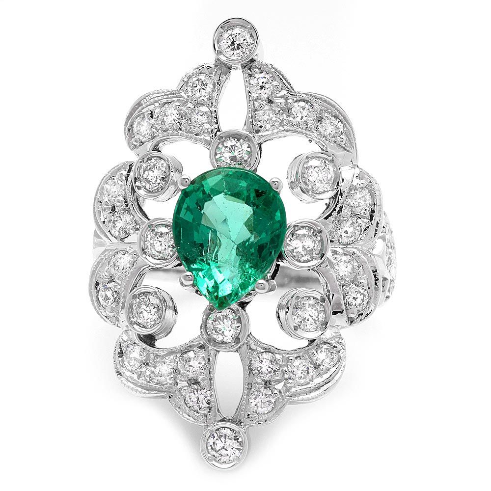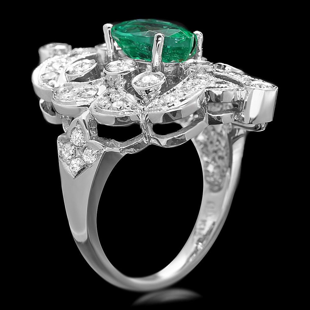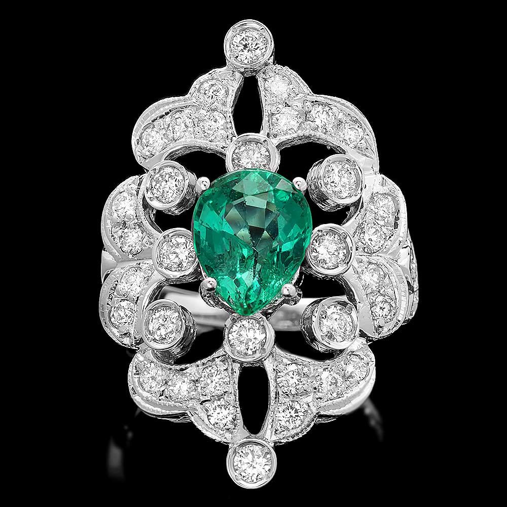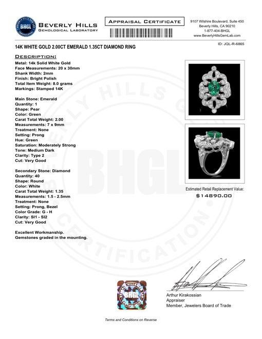 Retail: $14890.00 ****** Metal: 14k Solid White Gold / Size: 7.25 / Total Item Weight: 8.0 grams / Country Made: USA / / Main Stone: Emerald / Color: Green / Carat Total Weight: 2.00 / Treatment: None / Clarity: Type 2 / Cut: Very Good / / Secondary Stone: Diamond / Carat Total Weight: 1.35 / Treatment: None / Color Grade: G - H / Clarity: SI1 - SI2 / Cut: Very Good / ****** Ref: JQL-R-6865