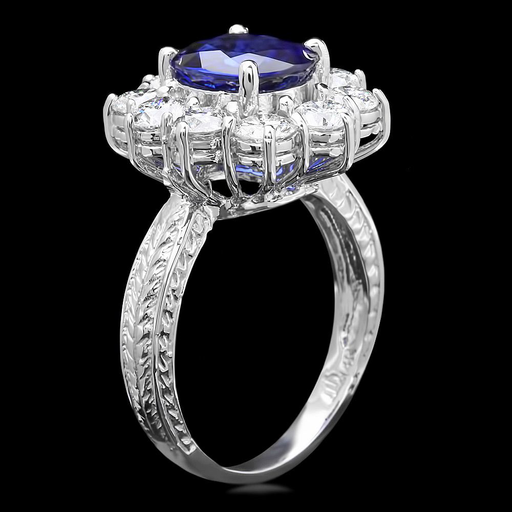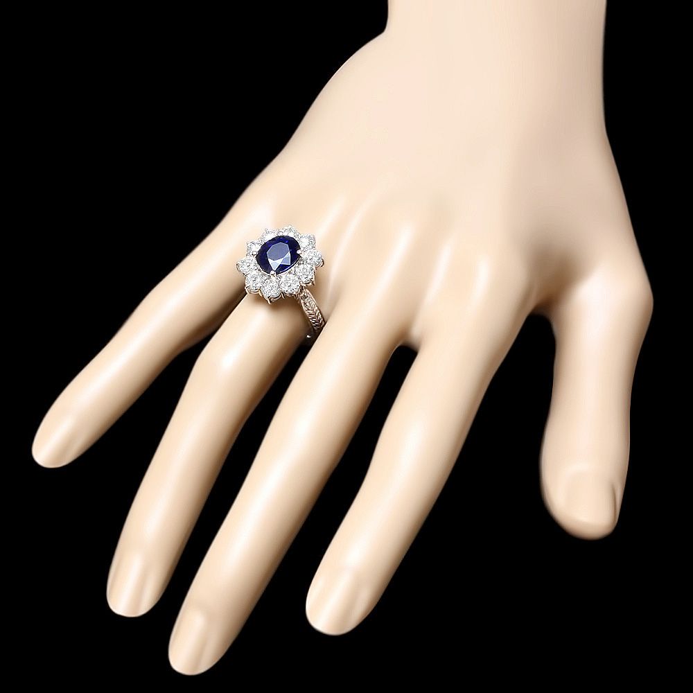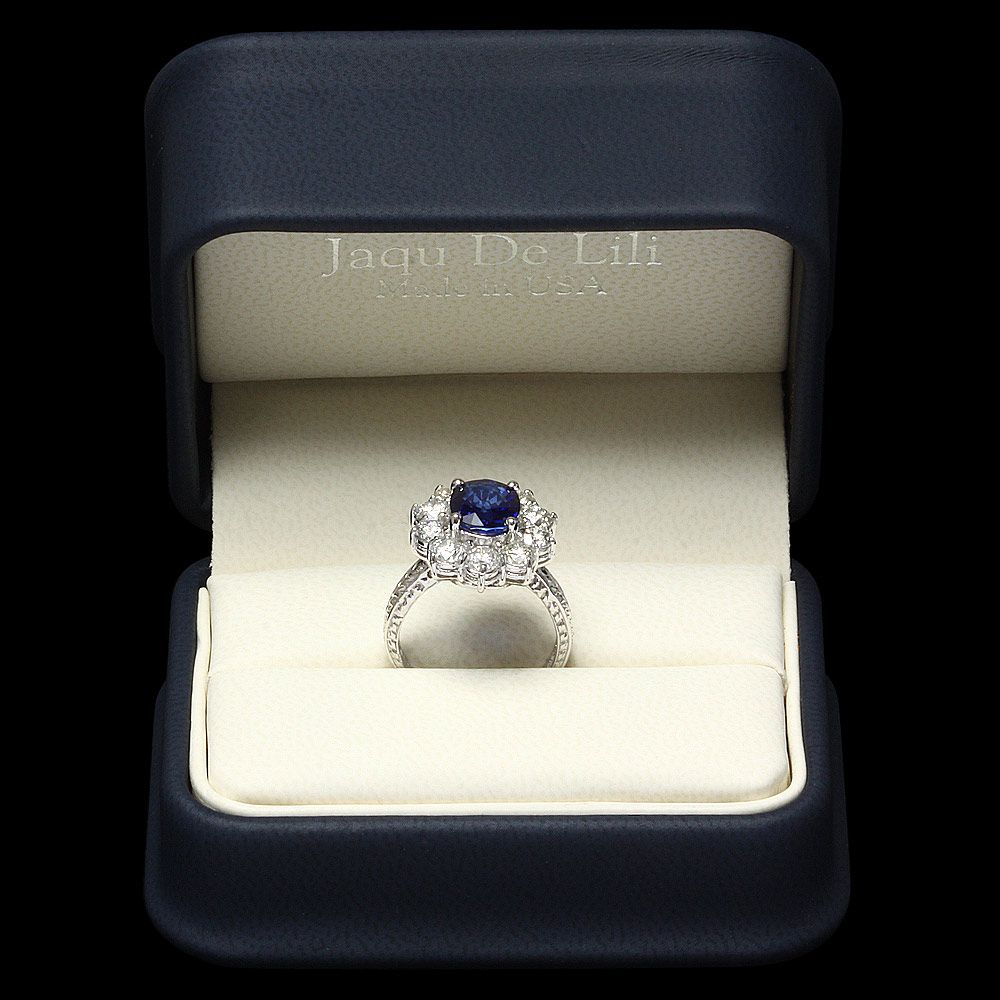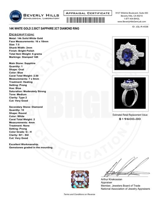 Retail: $19600.00 ****** Metal: 14k Solid White Gold / Size: 7.5 / Total Item Weight: 6 grams / Country Made: USA / / Main Stone: Sapphire / Color: Blue / Carat Total Weight: 2.50 / Treatment: Heating / Clarity: Type 2 / Cut: Very Good / / Secondary Stone: Diamond / Carat Total Weight: 2 / Treatment: None / Color Grade: G - H / Clarity: SI1 - SI2 / Cut: Very Good / ****** Ref: JQL-R-4536