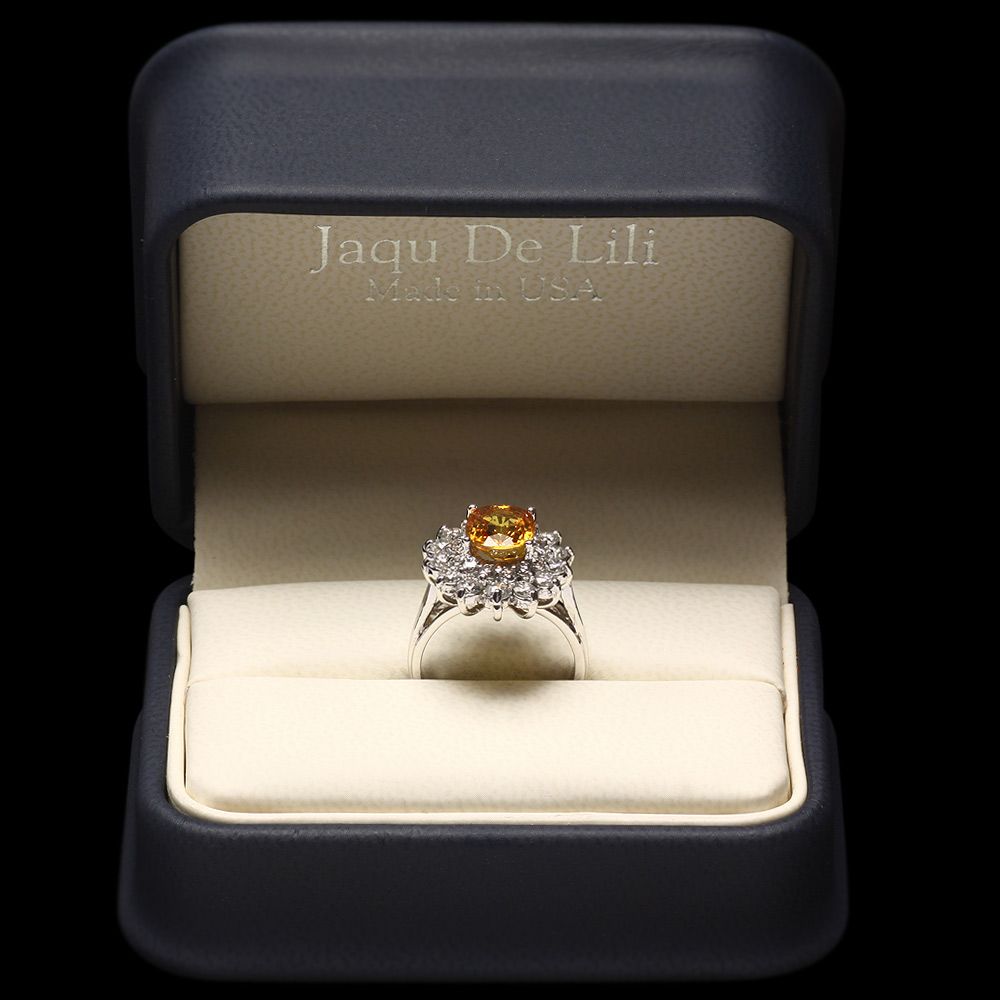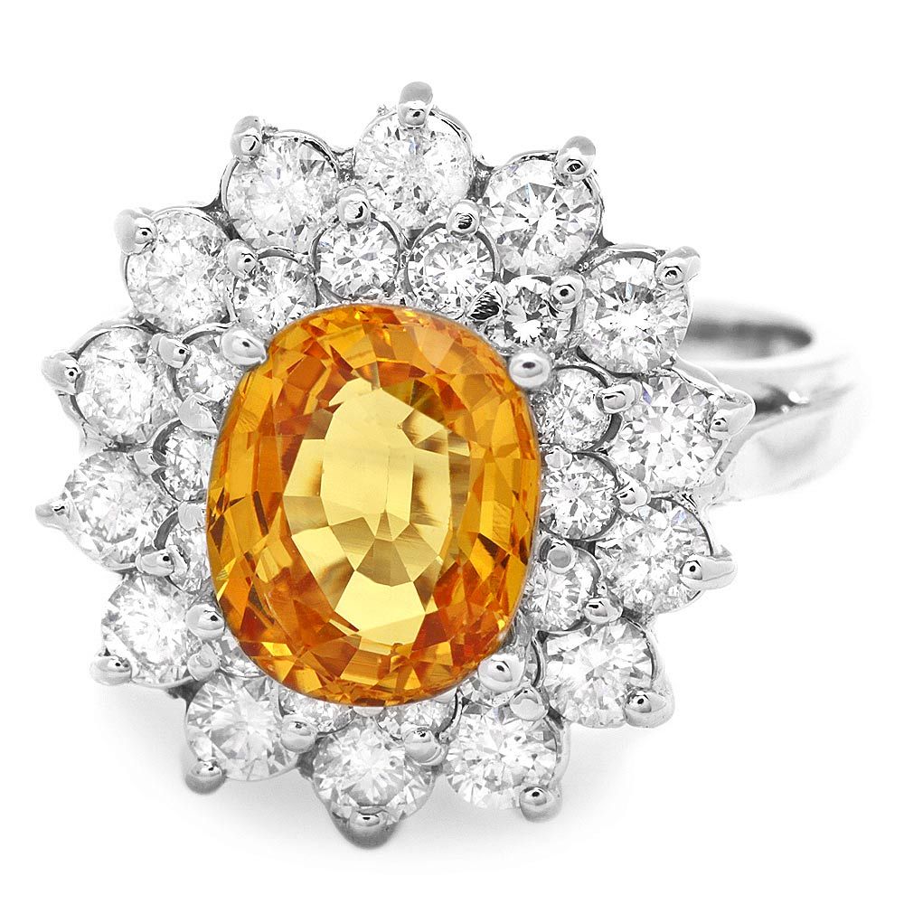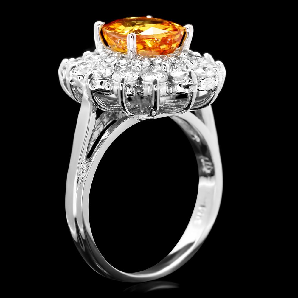 Retail: $11560.00 ****** Metal: 14k Solid White Gold / Size: 5.5 / Total Item Weight: 5.5 grams / Country Made: USA / / Main Stone: Sapphire / Color: Yellow / Carat Total Weight: 2.75 / Treatment: Heating / Clarity: Type 2 / Cut: Very Good / / Secondary Stone: Diamond / Carat Total Weight: 1.40 / Treatment: None / Color Grade: G - H / Clarity: SI1 - SI2 / Cut: Very Good / ****** Ref: JQL-R-6727
