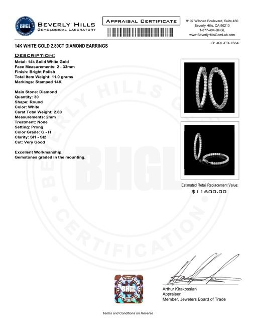 Retail: $11600.00 ****** Metal: 14k Solid White Gold / Total Item Weight: 11.0 grams / Country Made: USA / / Main Stone: Diamond / Color: White / Carat Total Weight: 2.80 / Treatment: None / Color Grade: G - H / Clarity: SI1 - SI2 / Cut: Very Good / ****** Ref: JQL-ER-7664