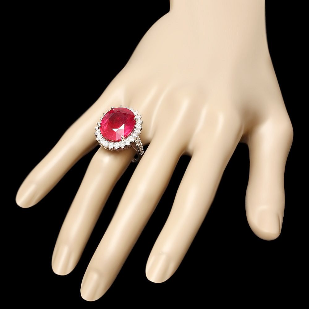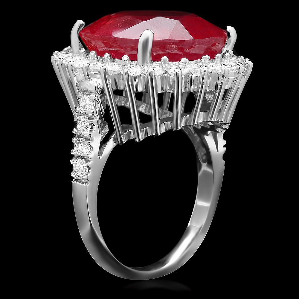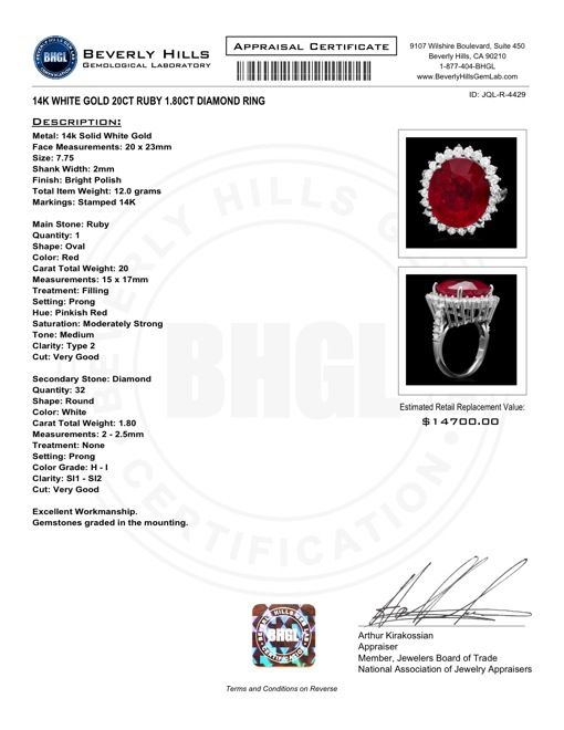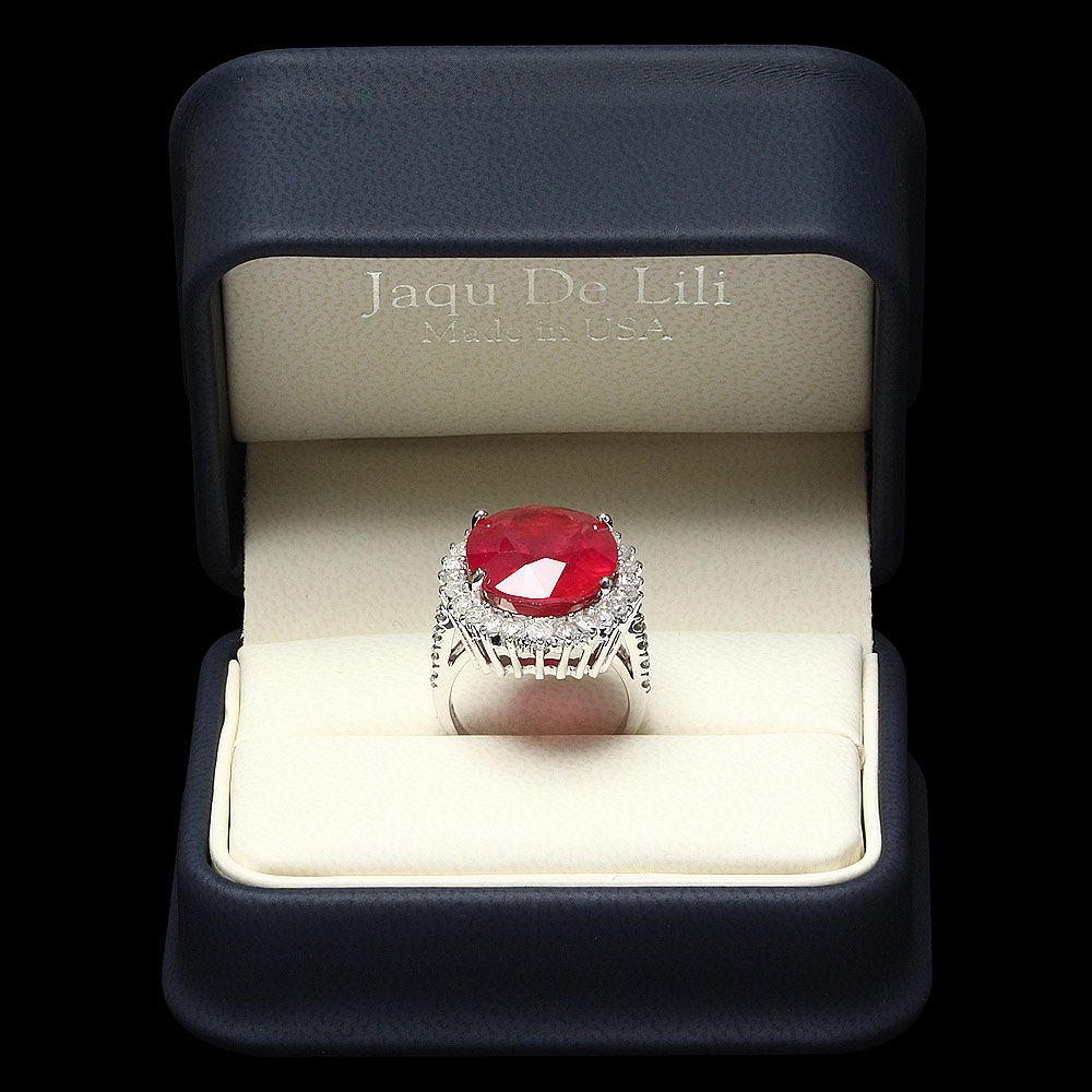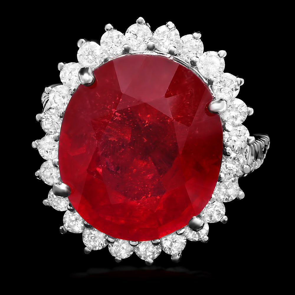 Retail: $14700.00 ****** Metal: 14k Solid White Gold / Size: 7.75 / Total Item Weight: 12.0 grams / Country Made: USA / / Main Stone: Ruby / Color: Red / Carat Total Weight: 20 / Treatment: Filling / Clarity: Type 2 / Cut: Very Good / / Secondary Stone: Diamond / Carat Total Weight: 1.80 / Treatment: None / Color Grade: H - I / Clarity: SI1 - SI2 / Cut: Very Good / ****** Ref: JQL-R-4429