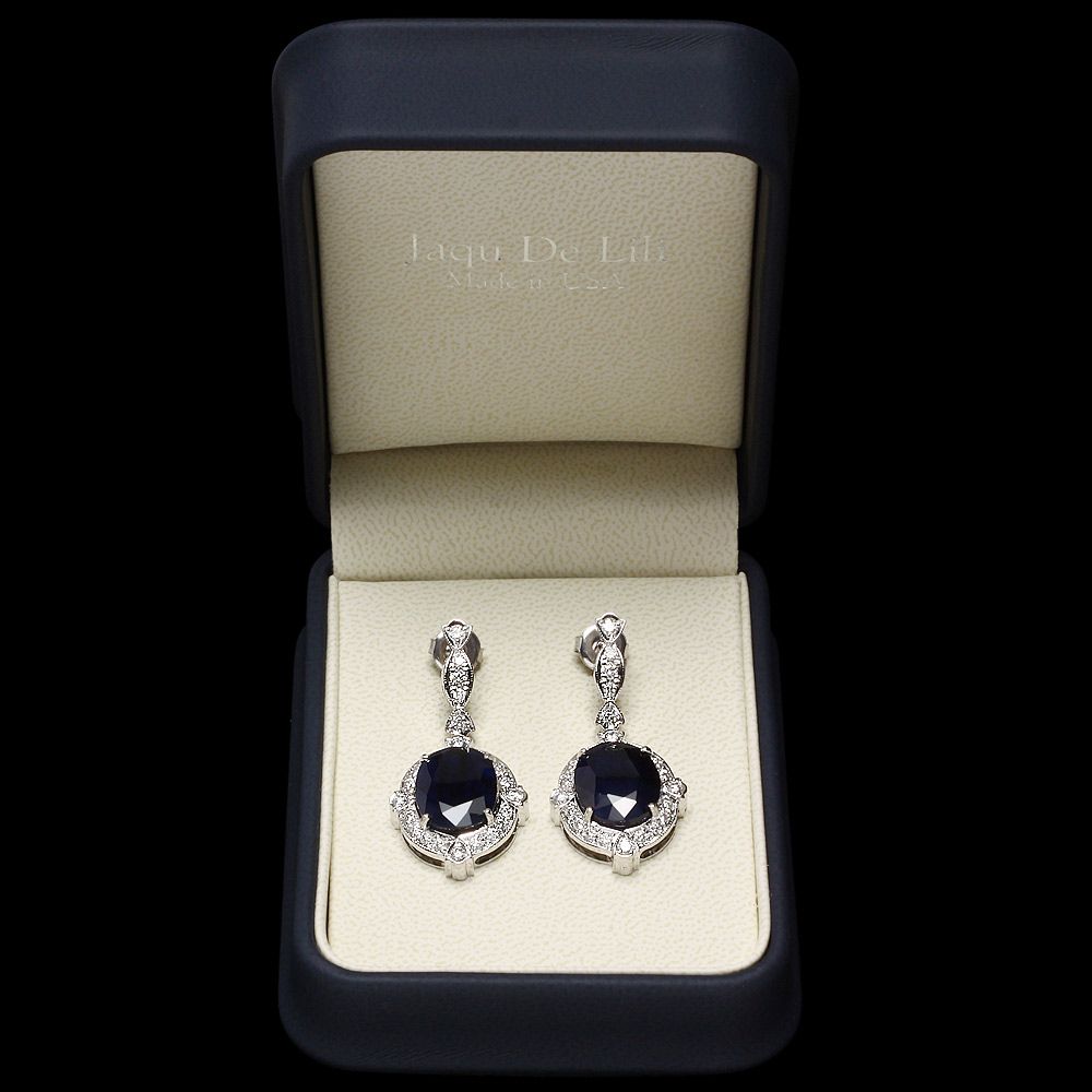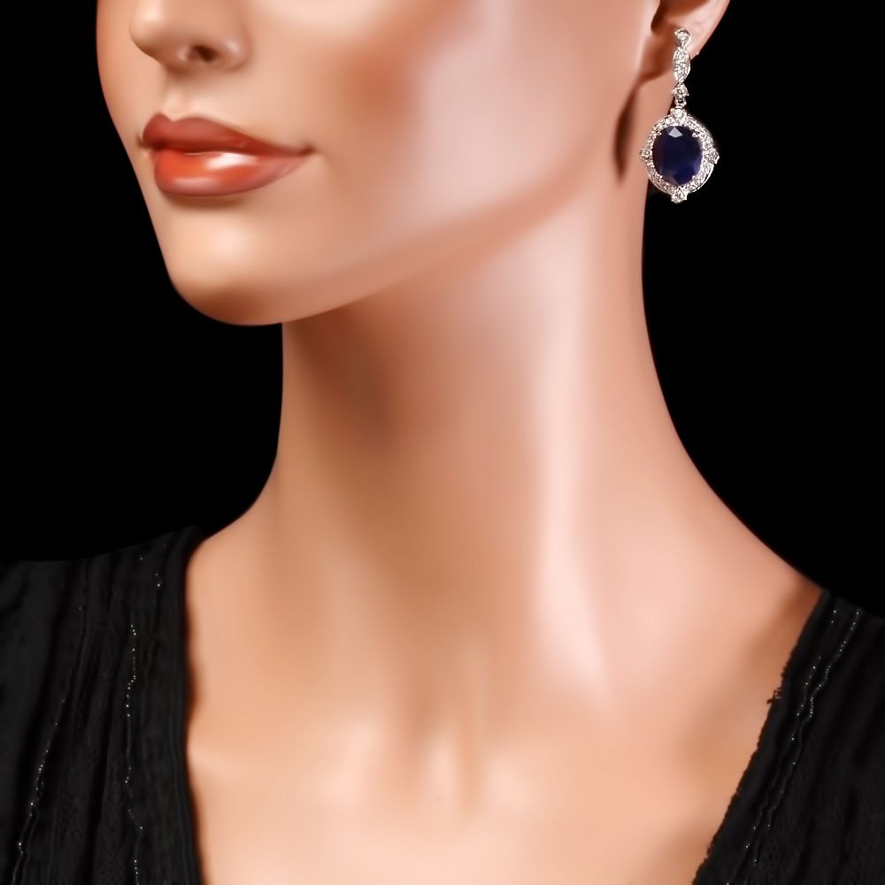 Retail: $21360.00 ****** Metal: 14k Solid White Gold / Total Item Weight: 13.0 grams / Country Made: USA / / Main Stone: Sapphire / Color: Blue / Carat Total Weight: 21.50 / Treatment: Heating / Clarity: Type 2 / Cut: Very Good / / Secondary Stone: Diamond / Carat Total Weight: 1.70 / Treatment: None / Color Grade: G - H / Clarity: SI1 - SI2 / Cut: Very Good / ****** Ref: JQL-ER-5729