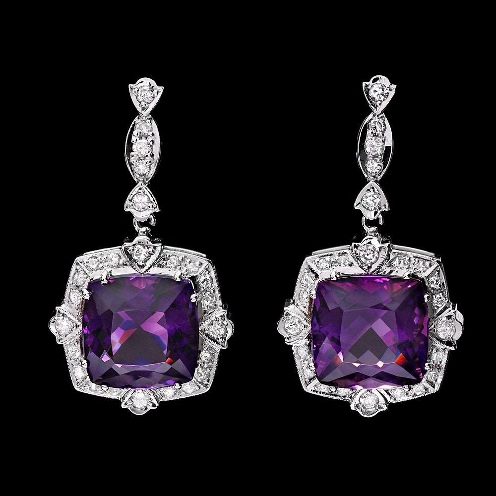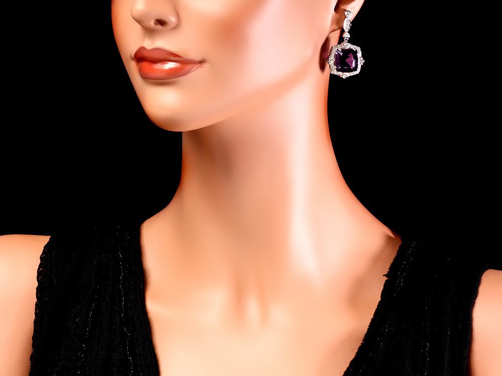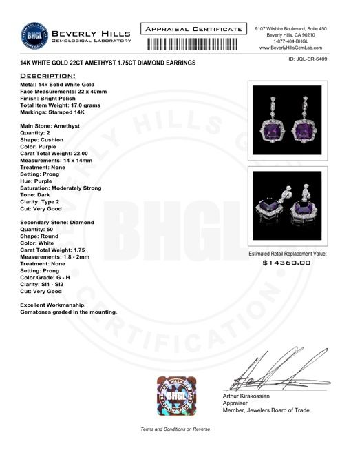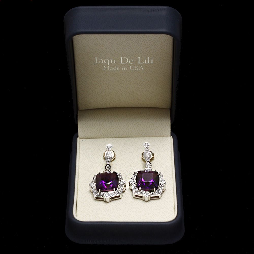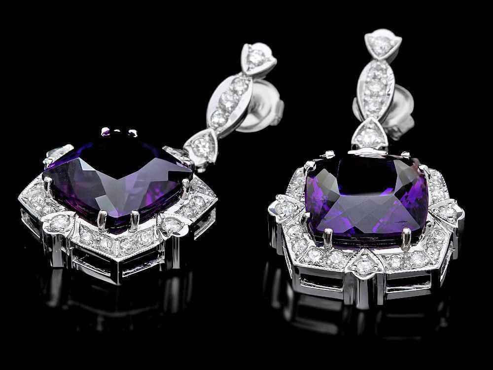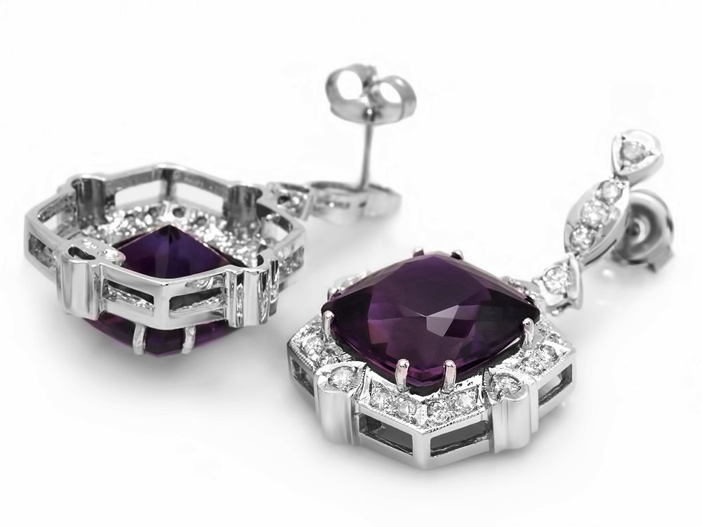 Retail: $14360.00 ****** Metal: 14k Solid White Gold / Total Item Weight: 17.0 grams / Country Made: USA / / Main Stone: Amethyst / Color: Purple / Carat Total Weight: 22.00 / Treatment: None / Clarity: Type 2 / Cut: Very Good / / Secondary Stone: Diamond / Carat Total Weight: 1.75 / Treatment: None / Color Grade: G - H / Clarity: SI1 - SI2 / Cut: Very Good / ****** Ref: JQL-ER-6409