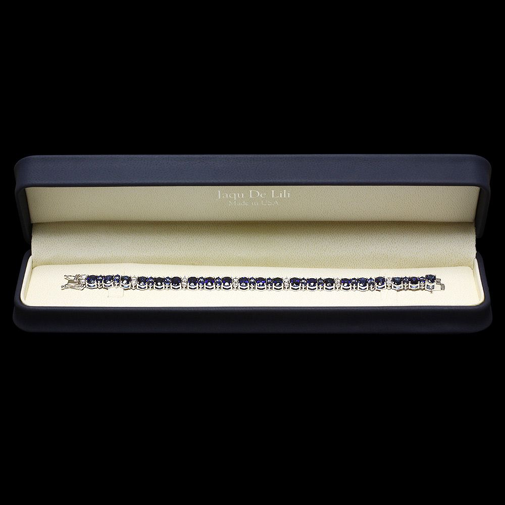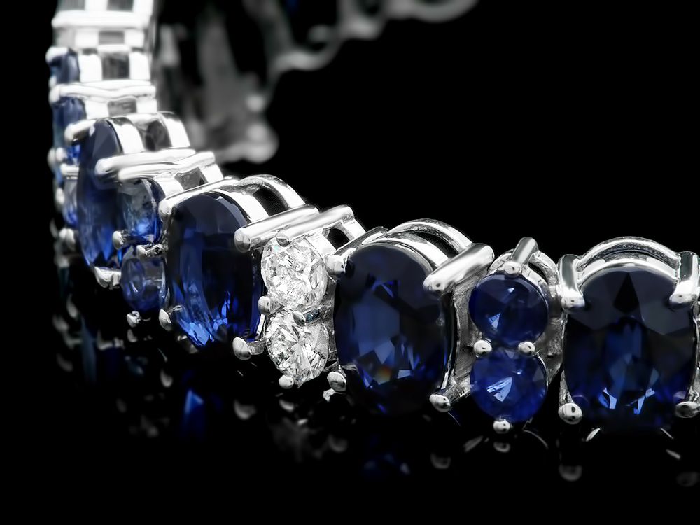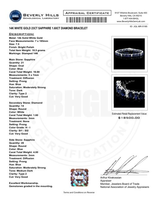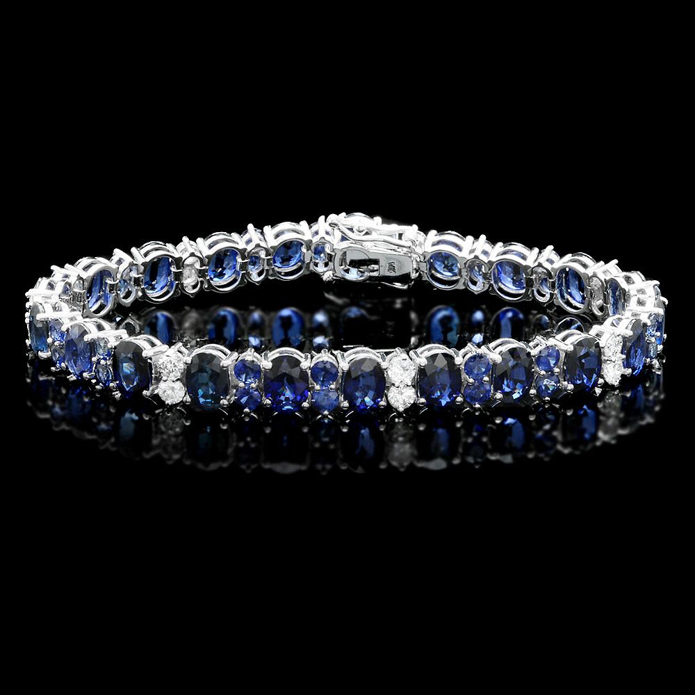Retail: $18500.00 ****** Metal: 14k Solid White Gold / Size: 7.5 / Total Item Weight: 18.5 grams / Country Made: USA / / Main Stone: Sapphire / Color: Blue / Carat Total Weight: 19.00 / Treatment: Diffusion / Clarity: Type 2 / Cut: Very Good / / Secondary Stone: Diamond / Carat Total Weight: 1.60 / Treatment: None / Color Grade: H - I / Clarity: SI1 - SI2 / Cut: Very Good / / Side Stone: Sapphire / Color: Blue / Carat Total Weight: 4.00 / Treatment: Diffusion / Clarity: Type 2 / Cut: Very Good / ****** Ref: JQL-BR-5185