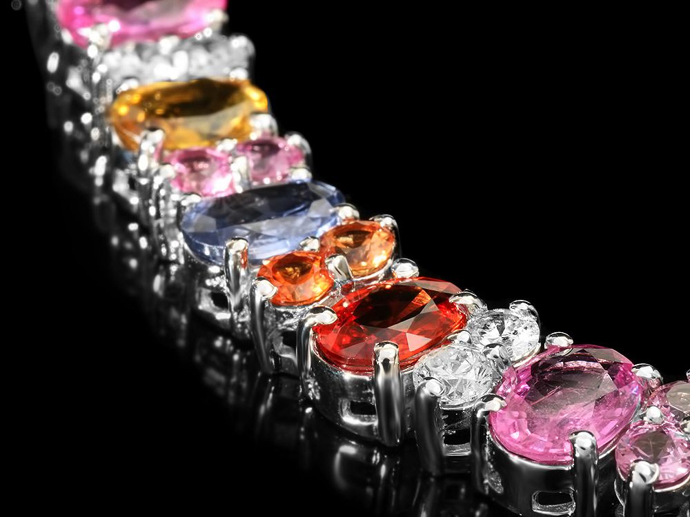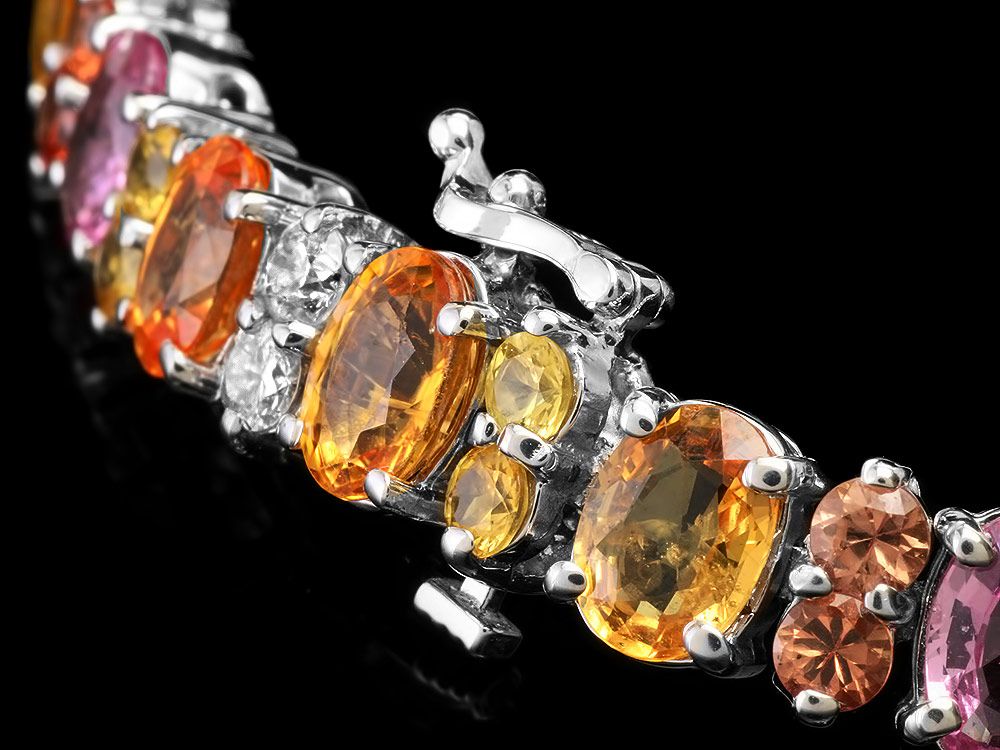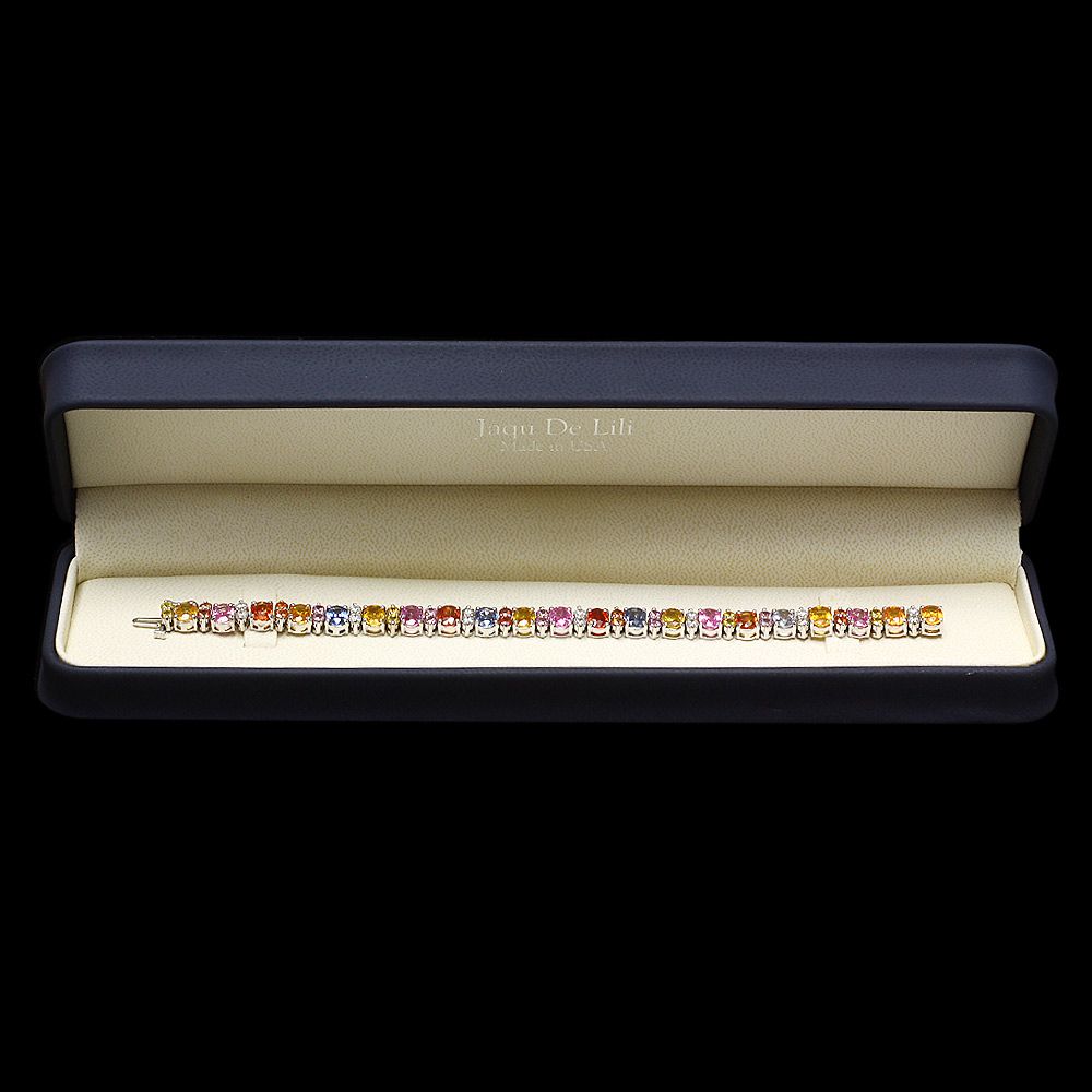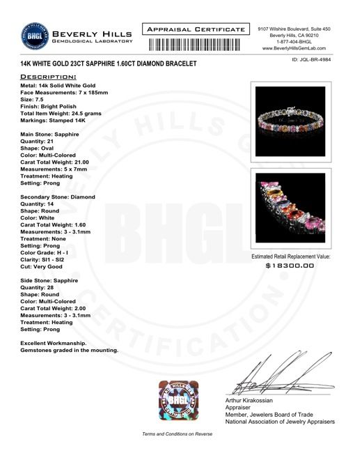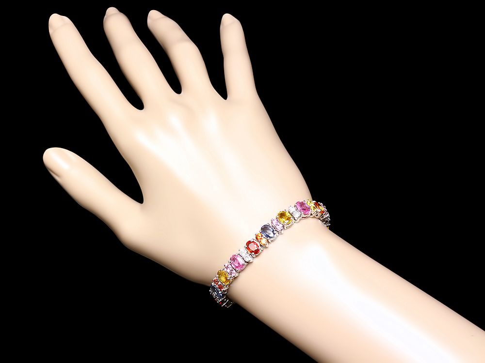 Retail: $18300.00 ****** Metal: 14k Solid White Gold / Size: 7.5 / Total Item Weight: 24.5 grams / Country Made: USA / / Main Stone: Sapphire / Color: Multi-Colored / Carat Total Weight: 21.00 / Treatment: Heating / / Secondary Stone: Diamond / Carat Total Weight: 1.60 / Treatment: None / Color Grade: H - I / Clarity: SI1 - SI2 / Cut: Very Good / / Side Stone: Sapphire / Color: Multi-Colored / Carat Total Weight: 2.00 / Treatment: Heating / ****** Ref: JQL-BR-4984