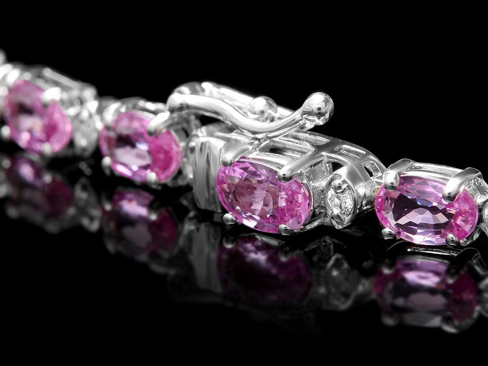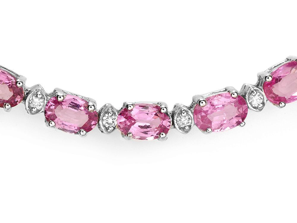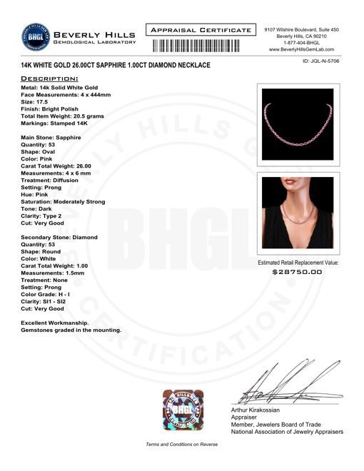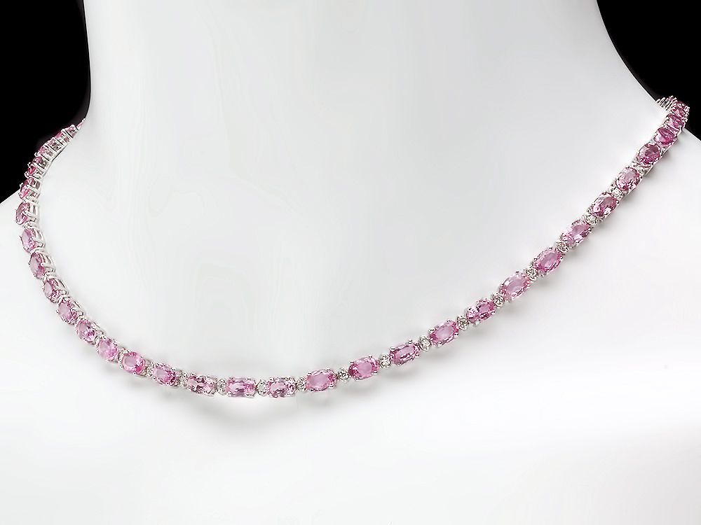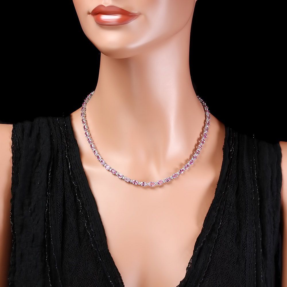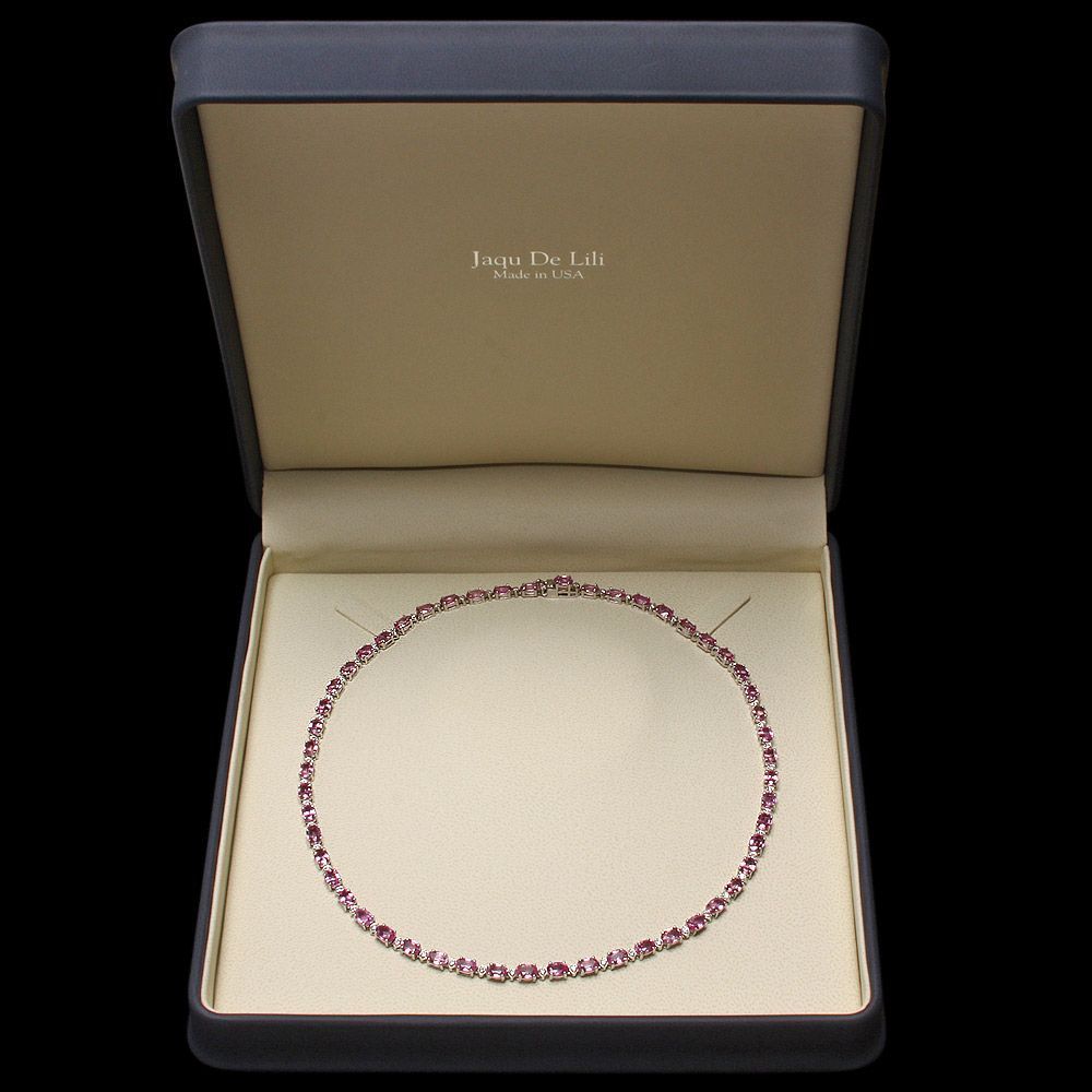 This stunning ladies necklace is crafted in solid 14k White Gold and features 53 (26.00 ctw) Natural Sapphires mined from Ceylon, Sri Lanka + accented with 53 sparkling eye-clean natural Diamonds, totaling 1.00 carats. Excellent craftsmanship. Made in USA.