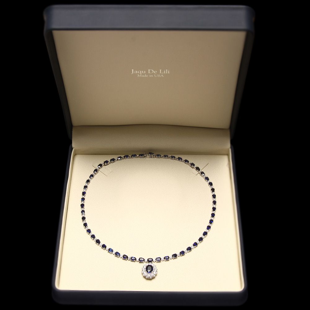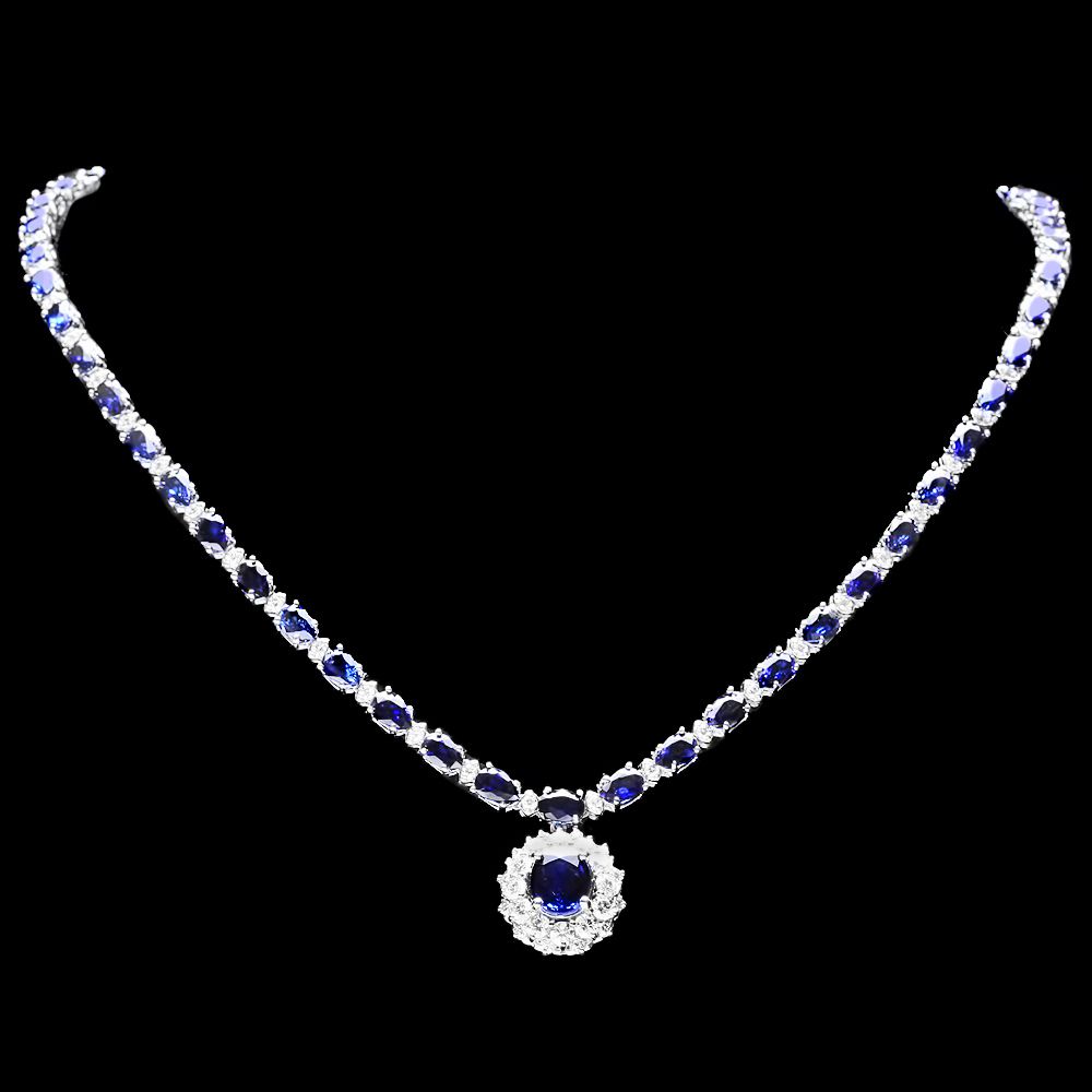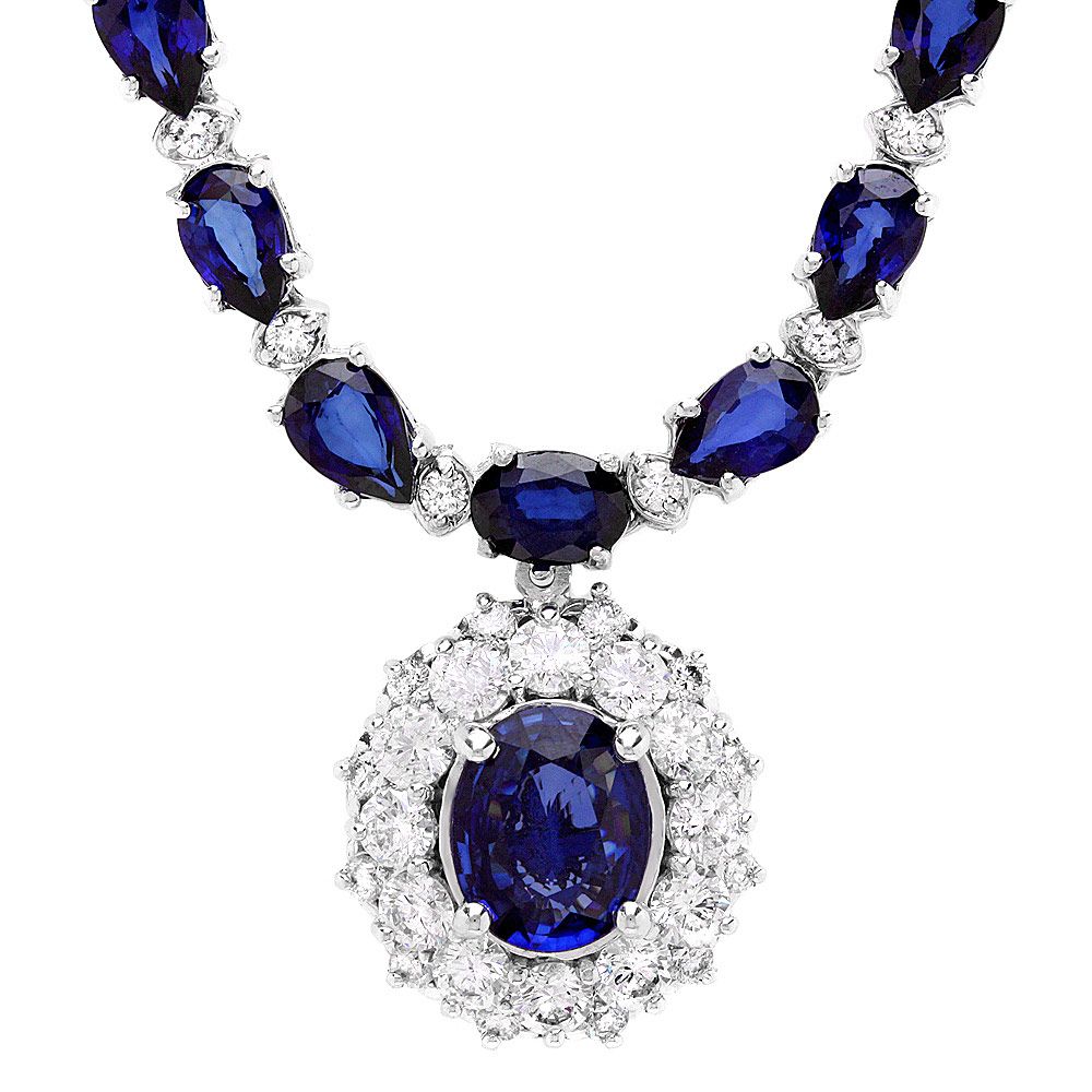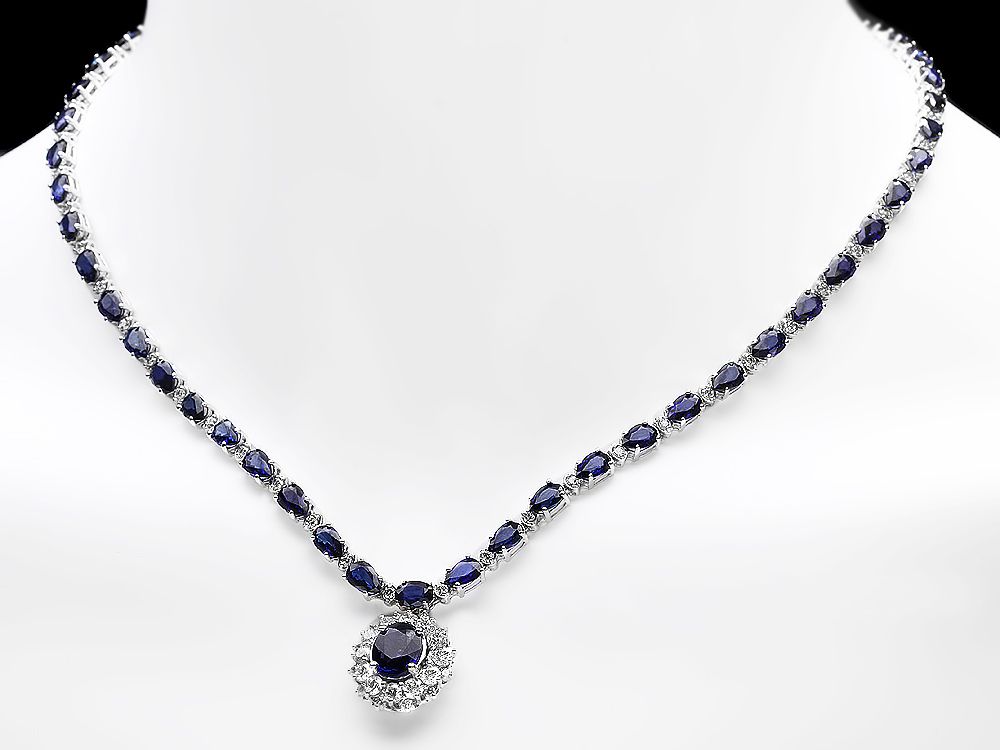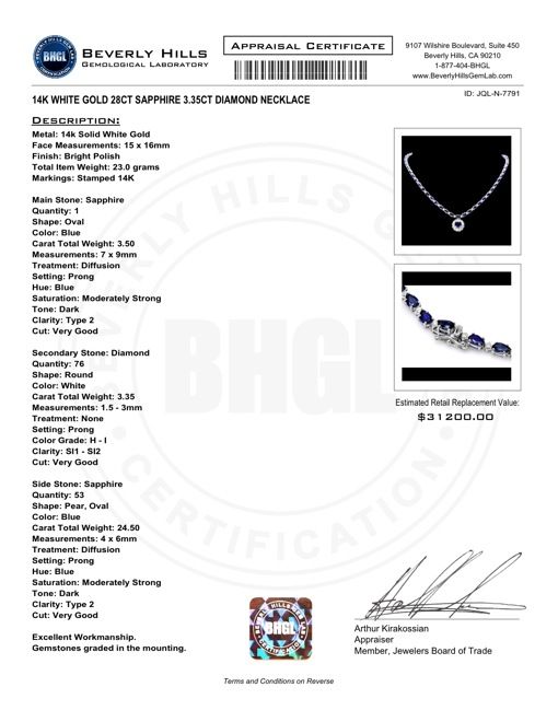 Retail: $31200.00 ****** Metal: 14k Solid White Gold / Size: 17 / Total Item Weight: 23.0 grams / Country Made: USA / / Main Stone: Sapphire / Color: Blue / Carat Total Weight: 3.50 / Treatment: Diffusion / Clarity: Type 2 / Cut: Very Good / / Secondary Stone: Diamond / Carat Total Weight: 3.35 / Treatment: None / Color Grade: H - I / Clarity: SI1 - SI2 / Cut: Very Good / / Side Stone: Sapphire / Color: Blue / Carat Total Weight: 24.50 / Treatment: Diffusion / Clarity: Type 2 / Cut: Very Good / ****** Ref: JQL-N-7791