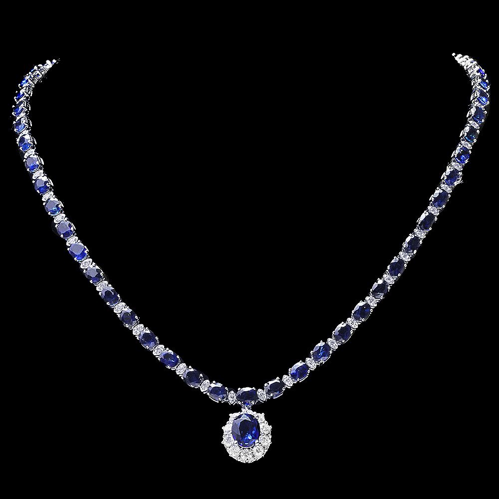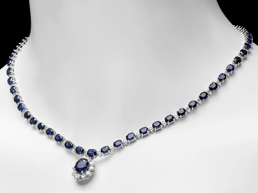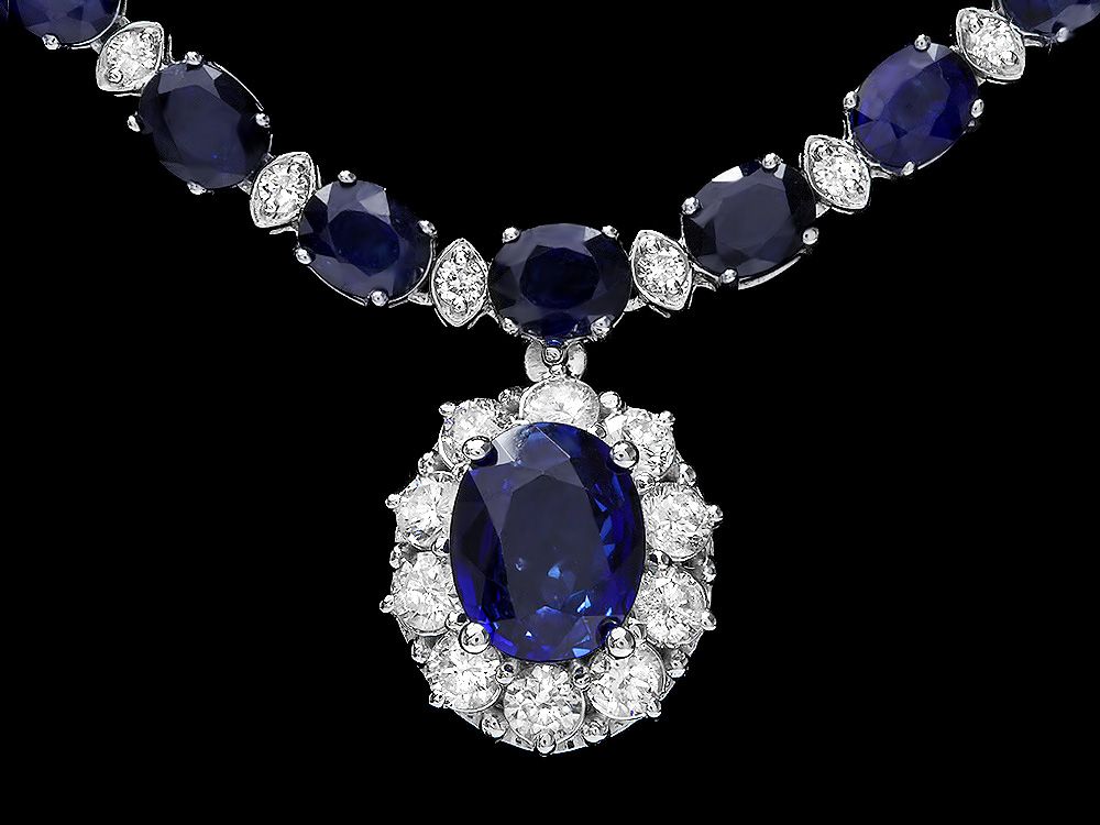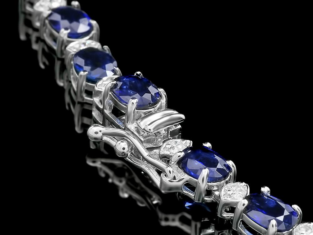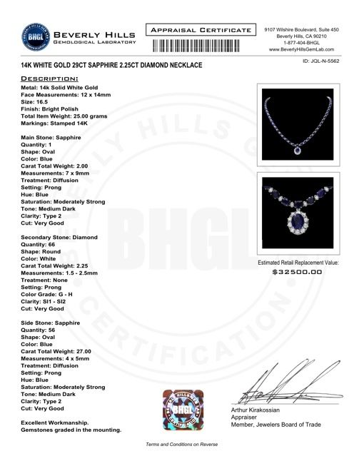 Retail: $32500.00 ****** Metal: 14k Solid White Gold / Size: 16.5 / Total Item Weight: 25.00 grams / Country Made: USA / / Main Stone: Sapphire / Color: Blue / Carat Total Weight: 2.00 / Treatment: Diffusion / Clarity: Type 2 / Cut: Very Good / / Secondary Stone: Diamond / Carat Total Weight: 2.25 / Treatment: None / Color Grade: G - H / Clarity: SI1 - SI2 / Cut: Very Good / / Side Stone: Sapphire / Color: Blue / Carat Total Weight: 27.00 / Treatment: Diffusion / Clarity: Type 2 / Cut: Very Good / ****** Ref: JQL-N-5562