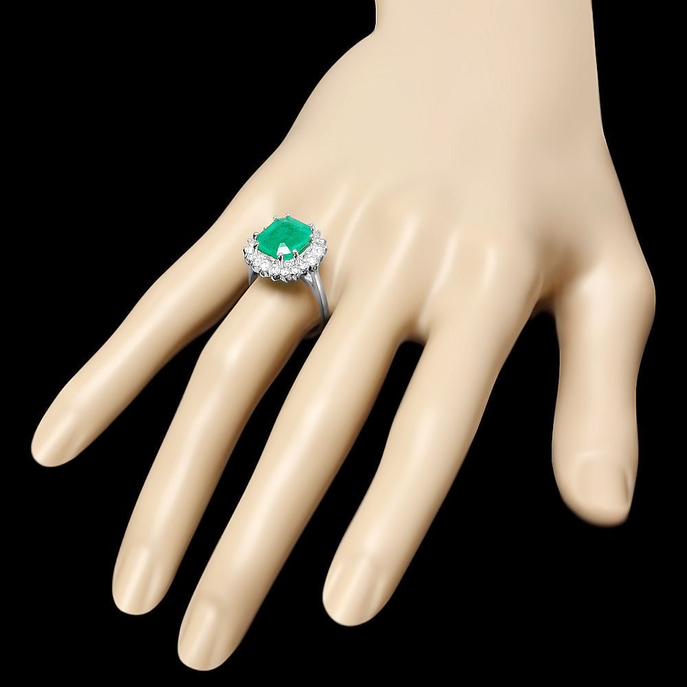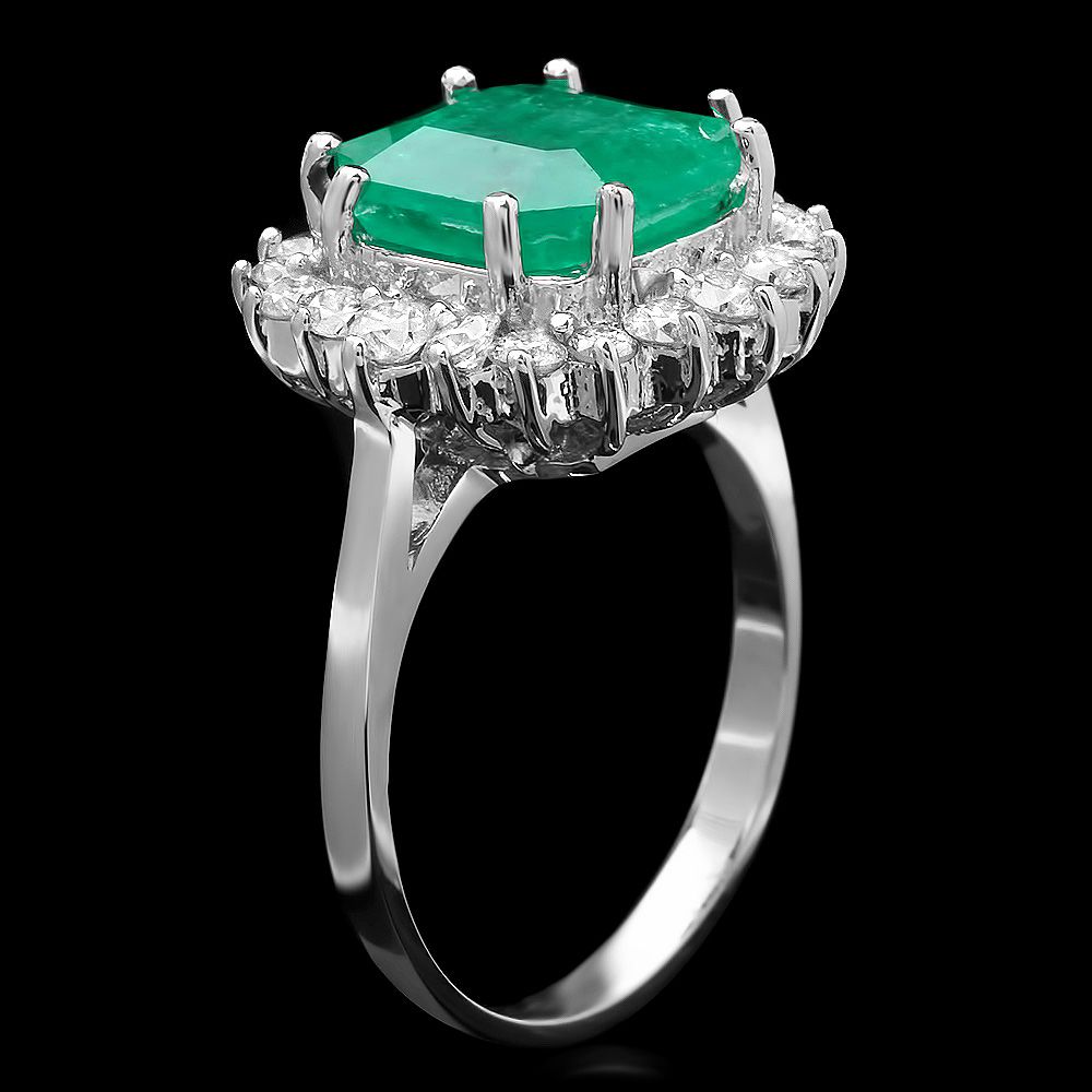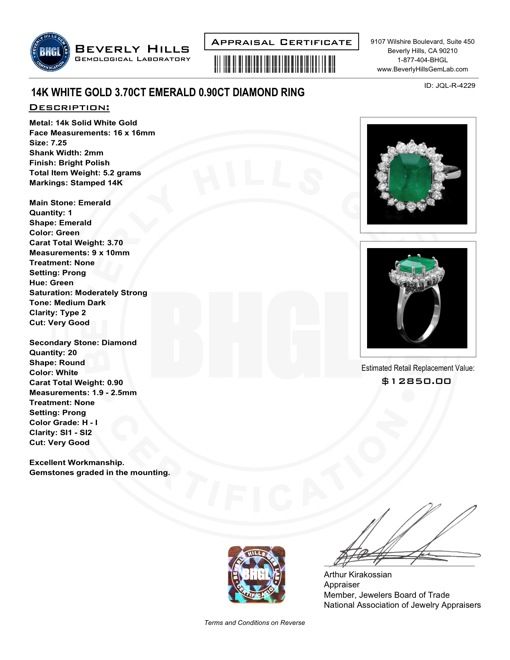 Retail: $12850.00 ****** Metal: 14k Solid White Gold / Size: 7.25 / Total Item Weight: 5.2 grams / Country Made: USA / / Main Stone: Emerald / Color: Green / Carat Total Weight: 3.70 / Treatment: None / Clarity: Type 2 / Cut: Very Good / / Secondary Stone: Diamond / Carat Total Weight: 0.90 / Treatment: None / Color Grade: H - I / Clarity: SI1 - SI2 / Cut: Very Good / ****** Ref: JQL-R-4229