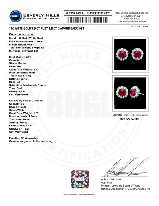 Retail: $8675.00 ****** Metal: 14k Solid White Gold / Total Item Weight: 5.0 grams / Country Made: USA / / Main Stone: Ruby / Color: Red / Carat Total Weight: 3.80 / Treatment: Filling / Clarity: Type 2 / Cut: Very Good / / Secondary Stone: Diamond / Carat Total Weight: 1.20 / Treatment: None / Color Grade: G - H / Clarity: SI1 - SI2 / Cut: Very Good / ****** Ref: JQL-ER-5874