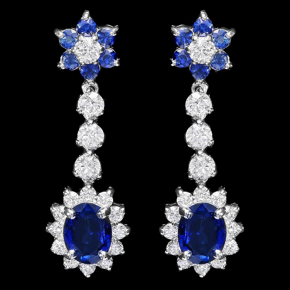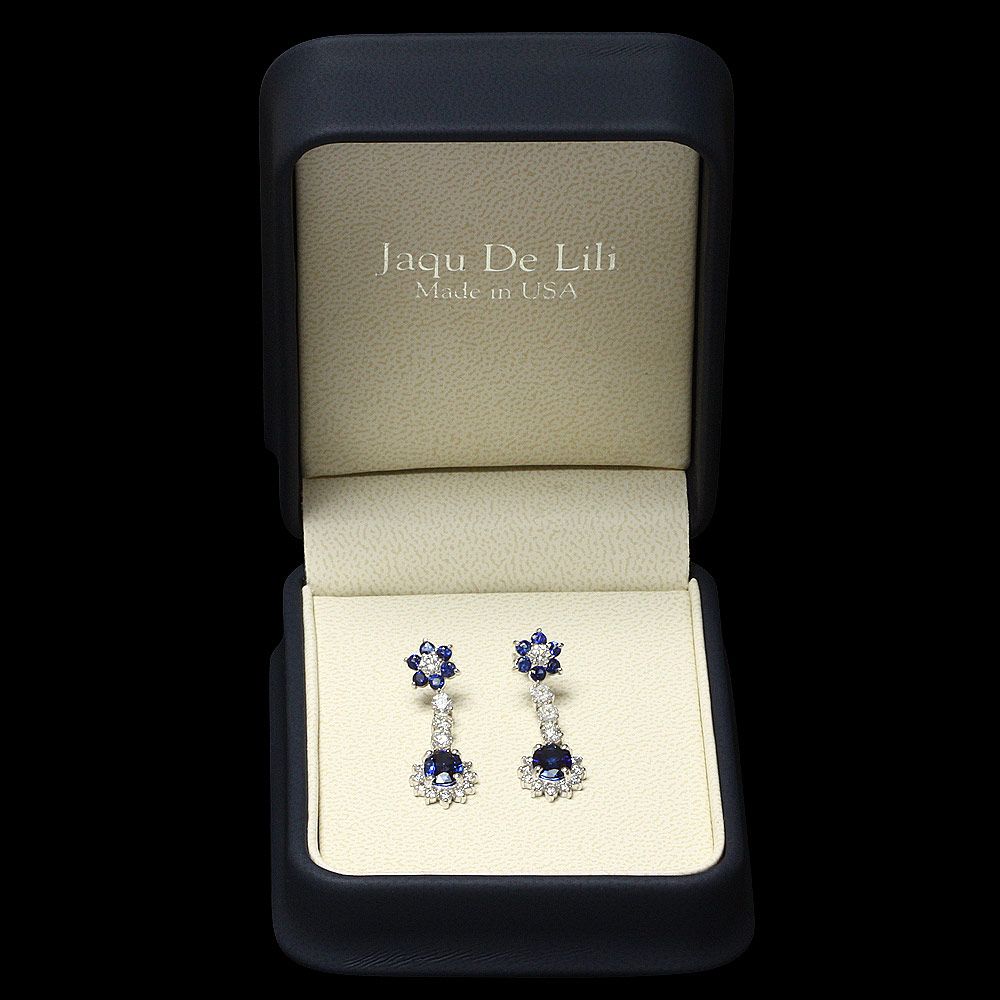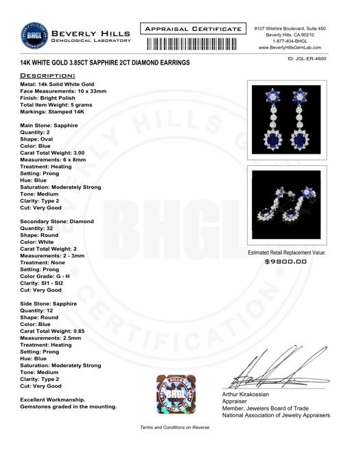 Retail: $9800.00 ****** Metal: 14k Solid White Gold / Total Item Weight: 5 grams / Country Made: USA / / Main Stone: Sapphire / Color: Blue / Carat Total Weight: 3.00 / Treatment: Heating / Clarity: Type 2 / Cut: Very Good / / Secondary Stone: Diamond / Carat Total Weight: 2 / Treatment: None / Color Grade: G - H / Clarity: SI1 - SI2 / Cut: Very Good / / Side Stone: Sapphire / Color: Blue / Carat Total Weight: 0.85 / Treatment: Heating / Clarity: Type 2 / Cut: Very Good / ****** Ref: JQL-ER-4600