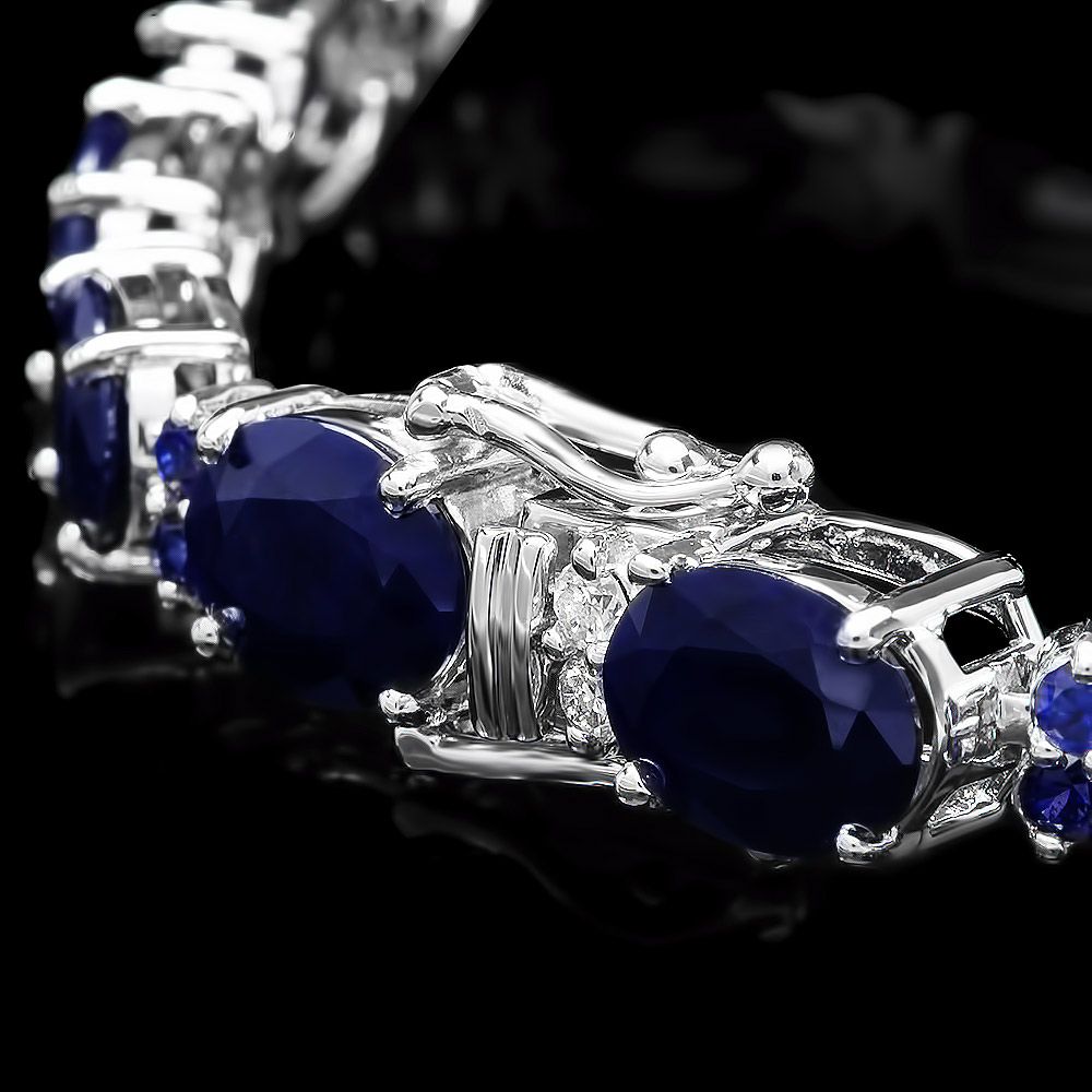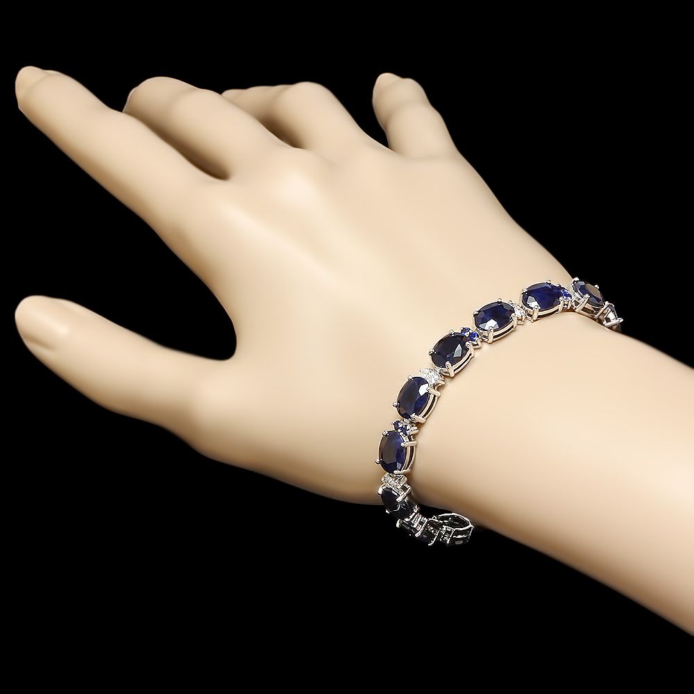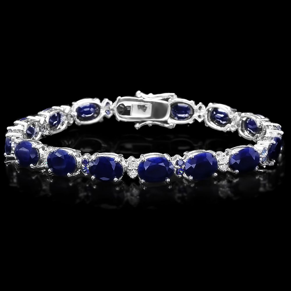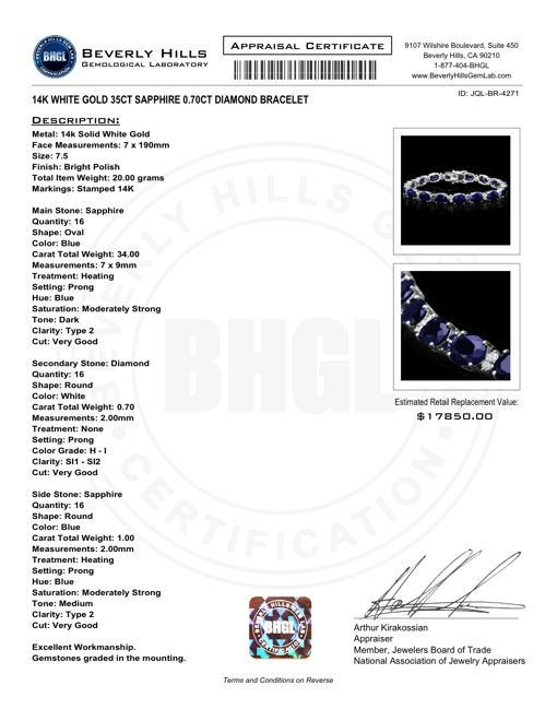 Retail: $17850.00 ****** Metal: 14k Solid White Gold / Size: 7.5 / Total Item Weight: 20.00 grams / Country Made: USA / / Main Stone: Sapphire / Color: Blue / Carat Total Weight: 34.00 / Treatment: Heating / Clarity: Type 2 / Cut: Very Good / / Secondary Stone: Diamond / Carat Total Weight: 0.70 / Treatment: None / Color Grade: H - I / Clarity: SI1 - SI2 / Cut: Very Good / / Side Stone: Sapphire / Color: Blue / Carat Total Weight: 1.00 / Treatment: Heating / Clarity: Type 2 / Cut: Very Good / ****** Ref: JQL-BR-4271