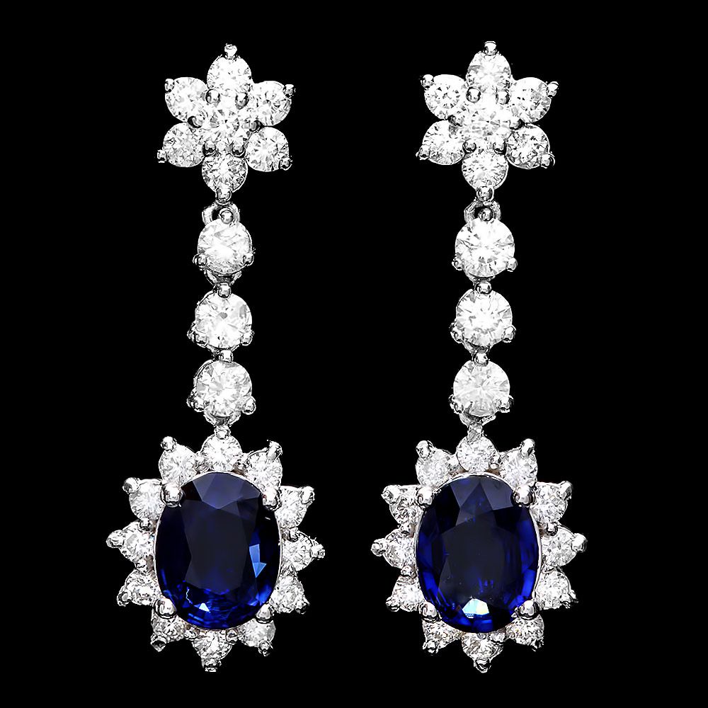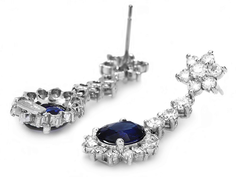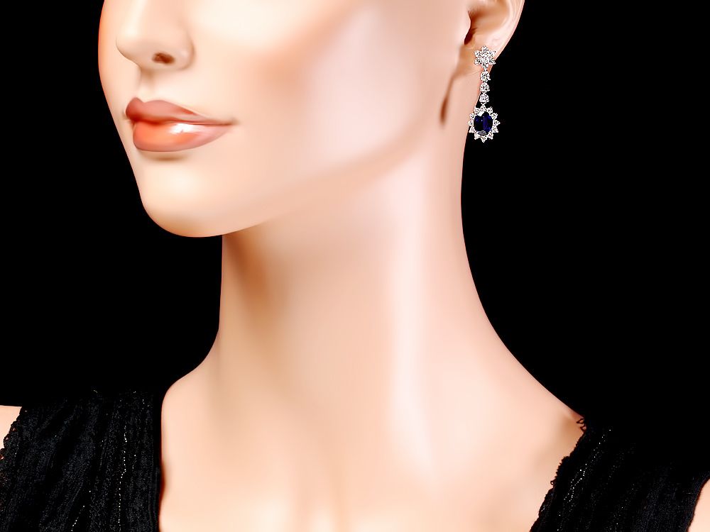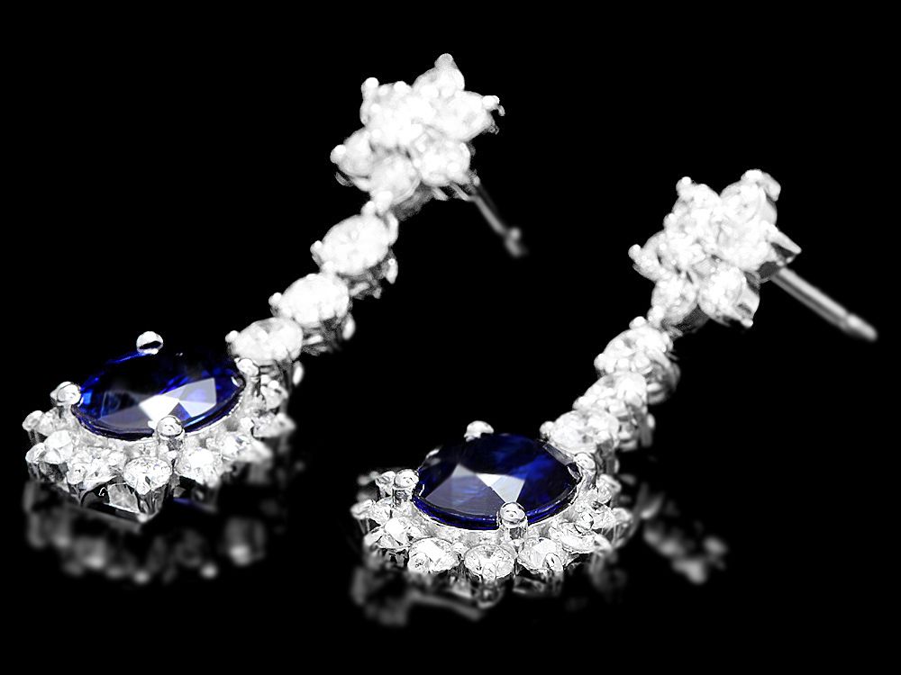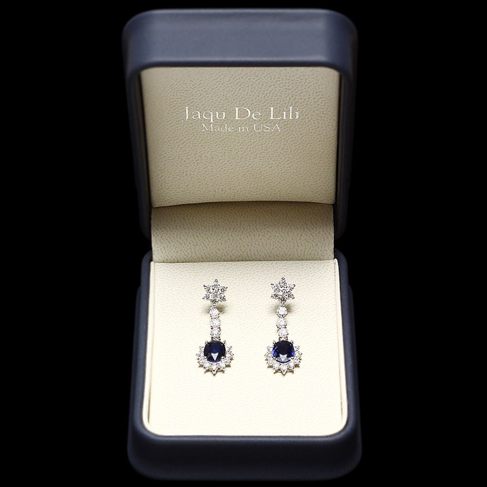 Retail: $12100.00 ****** Metal: 14k Solid White Gold / Total Item Weight: 6.0 grams / Country Made: USA / / Main Stone: Sapphire / Color: Blue / Carat Total Weight: 3.00 / Treatment: Diffusion / Clarity: Type 2 / Cut: Very Good / / Secondary Stone: Diamond / Carat Total Weight: 3.25 / Treatment: None / Color Grade: G - H / Clarity: SI1 - SI2 / Cut: Very Good / ****** Ref: JQL-ER-7532