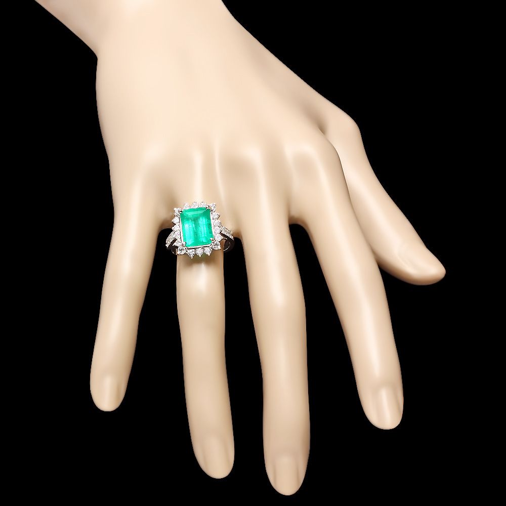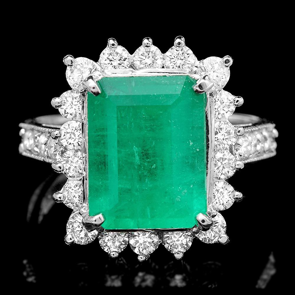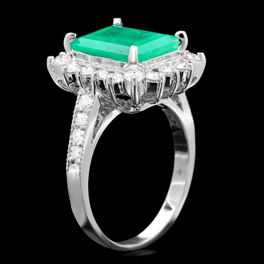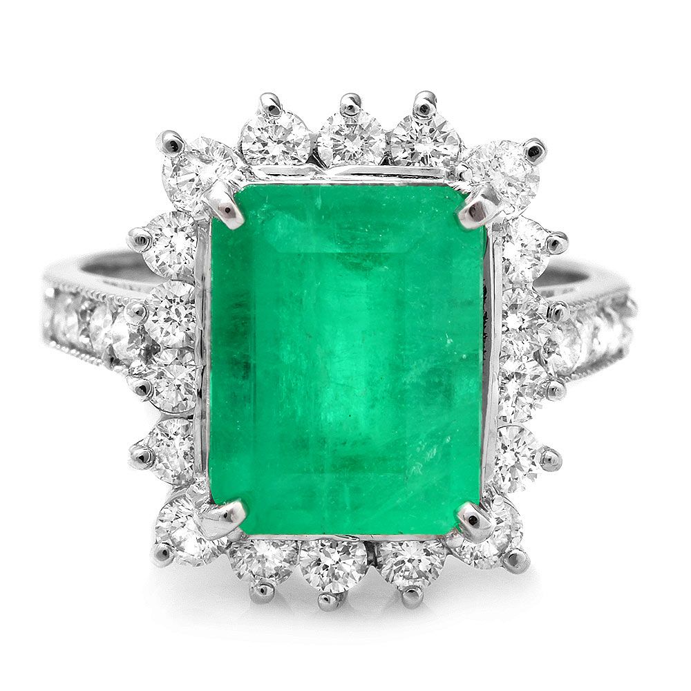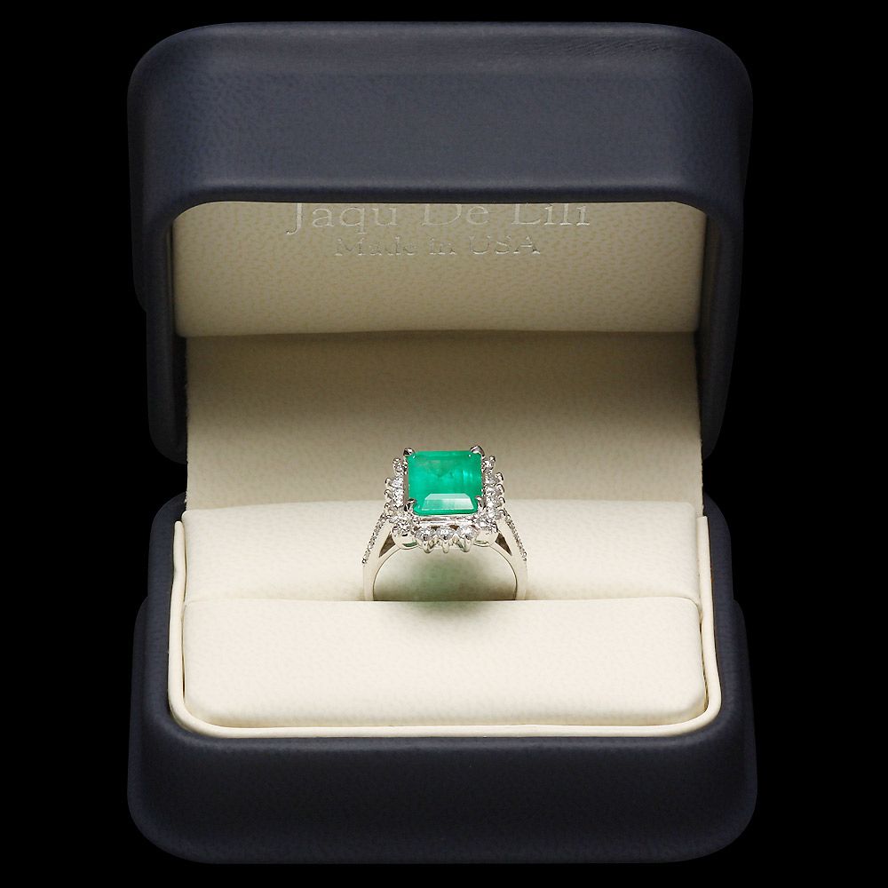 Retail: $24750.00 ****** Metal: 14k Solid White Gold / Size: 7 / Total Item Weight: 7.0 grams / Country Made: USA / / Main Stone: Emerald / Color: Green / Carat Total Weight: 4.00 / Treatment: None / Clarity: Type 2 / Cut: Very Good / / Secondary Stone: Diamond / Carat Total Weight: 1.00 / Treatment: None / Color Grade: G - H / Clarity: SI1 - SI2 / Cut: Very Good / ****** Ref: JQL-R-5904