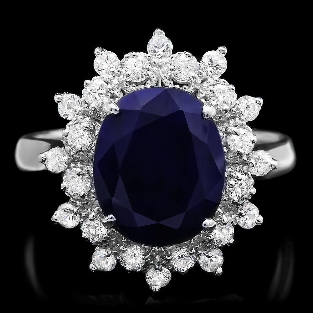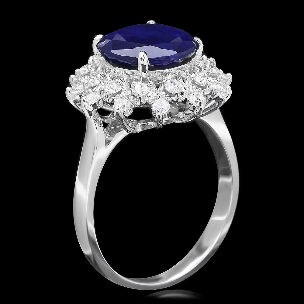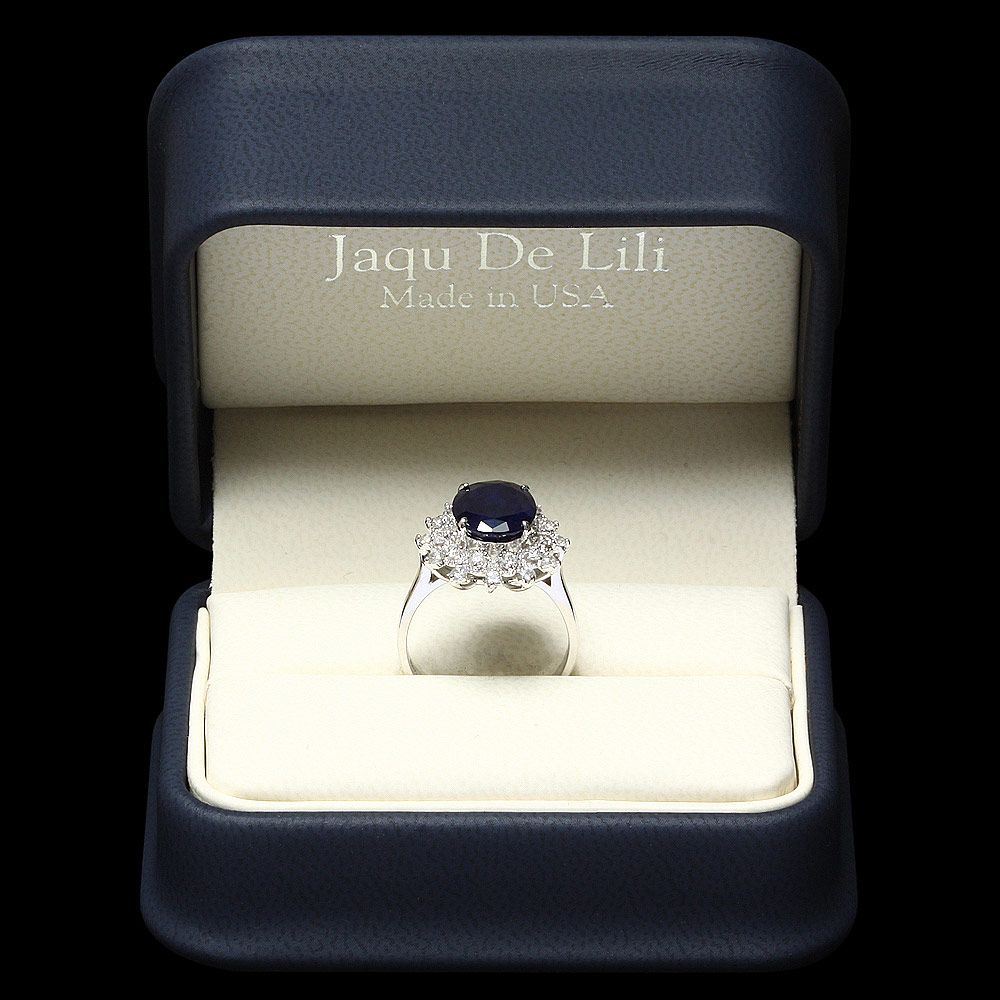 Retail: $3300.00 ****** Metal: 14k Solid White Gold / Size: 7.5 / Total Item Weight: 4.5 grams / Country Made: USA / / Main Stone: Sapphire / Color: Blue / Carat Total Weight: 4.00 / Treatment: Heating / Clarity: Type 2 / Cut: Very Good / / Secondary Stone: Diamond / Carat Total Weight: 0.65 / Treatment: None / Color Grade: H - I / Clarity: SI1 - SI2 / Cut: Very Good / ****** Ref: JQL-R-4371
