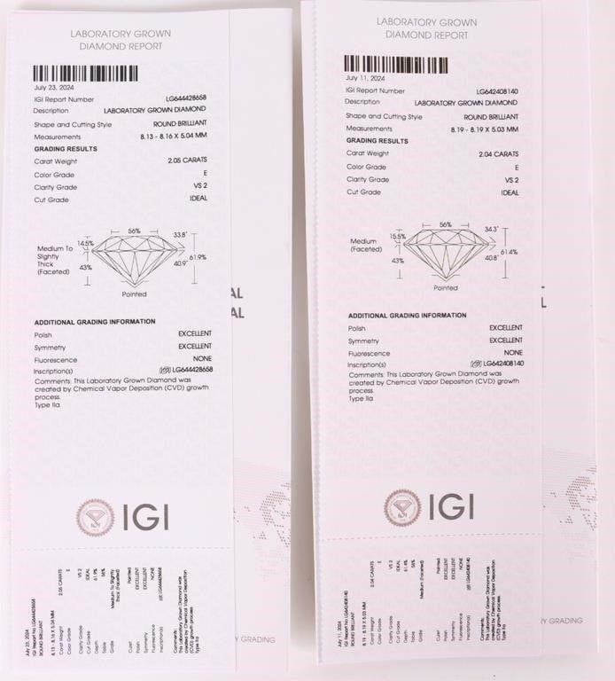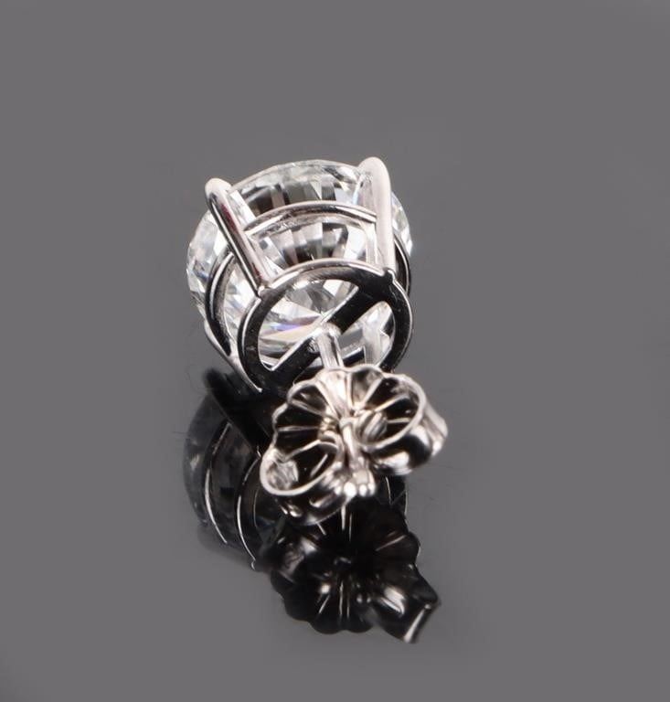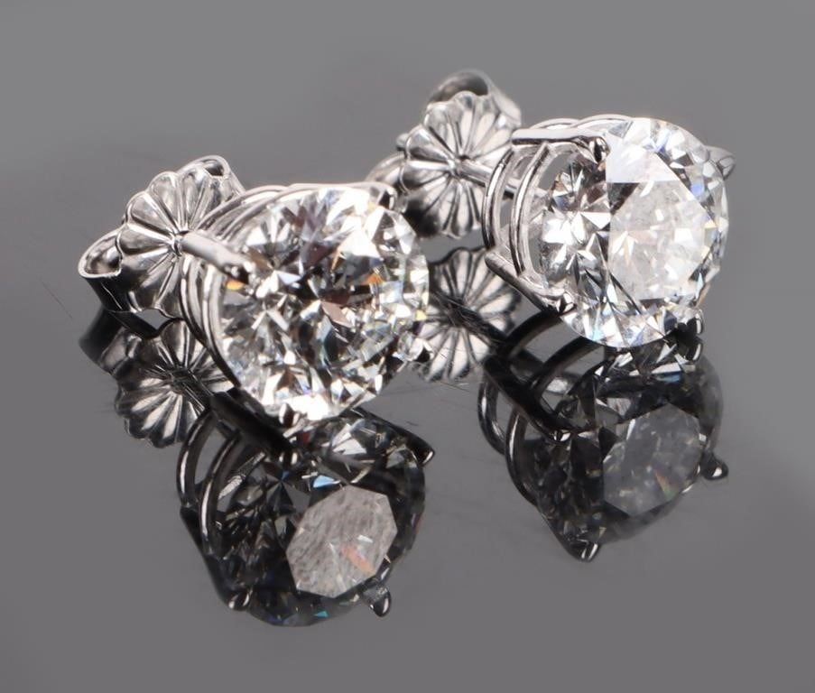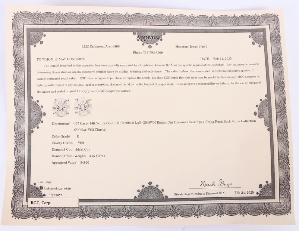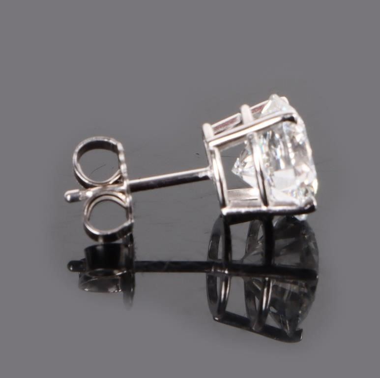 14K white gold 4.09CT lab diamond stud earrings IGI certified. Gemstones to include one IGI certified 2.05CT round cut VS-2 E color diamond, and one 2.04CT round cut VS-2 E color diamond. Also to include an Appraisal from Nitesh Daga, a Graduate Diamond GIA.